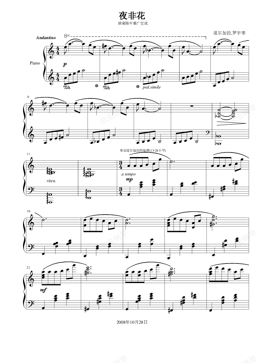 2008年10月28日作 最先以电琴录音方式保存 11月12日完成制谱 因制谱中的整理 试听和琴谱会有少量出入 道尔加拉是陈干在上海音乐学院的同学 两人皆为作曲系一年级生 9月底某天道尔加拉在学院琴房 无意中哼出动人的旋律 陈干受到启发 创作了"花非夜" /html/ 10月底罗宇荣(每一天)也受到启发 创作了"来自道尔加拉的旋律" /user/?id=3280 现改名"夜非花"回应陈干=P 两首钢琴曲都以道尔加拉的旋律为主题 道尔加拉的歌声 不论是无意唱出还是在比赛中唱出 其感染力和影响力 都是无容置疑的=P