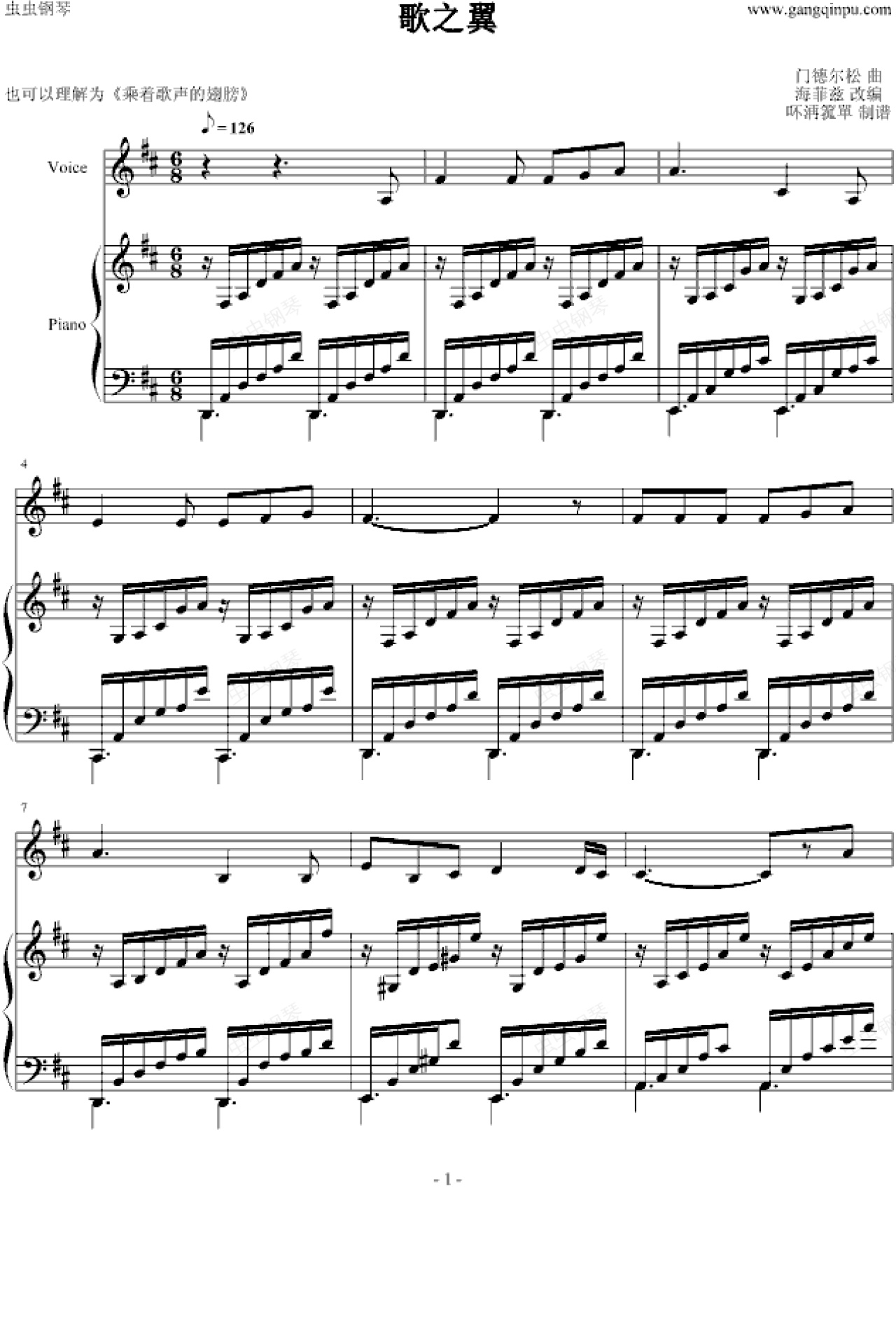 钢琴谱:乘着歌声的翅膀(伴奏兼难度版)