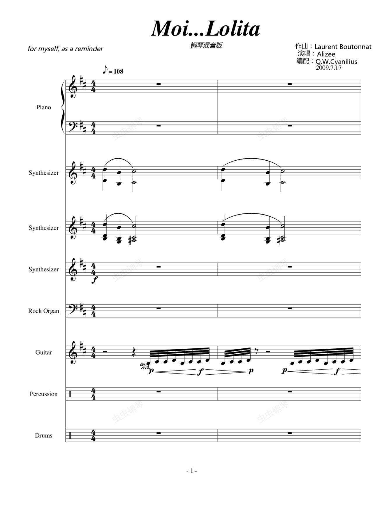 钢琴谱:Moi Lolita(钢琴混音版总谱)