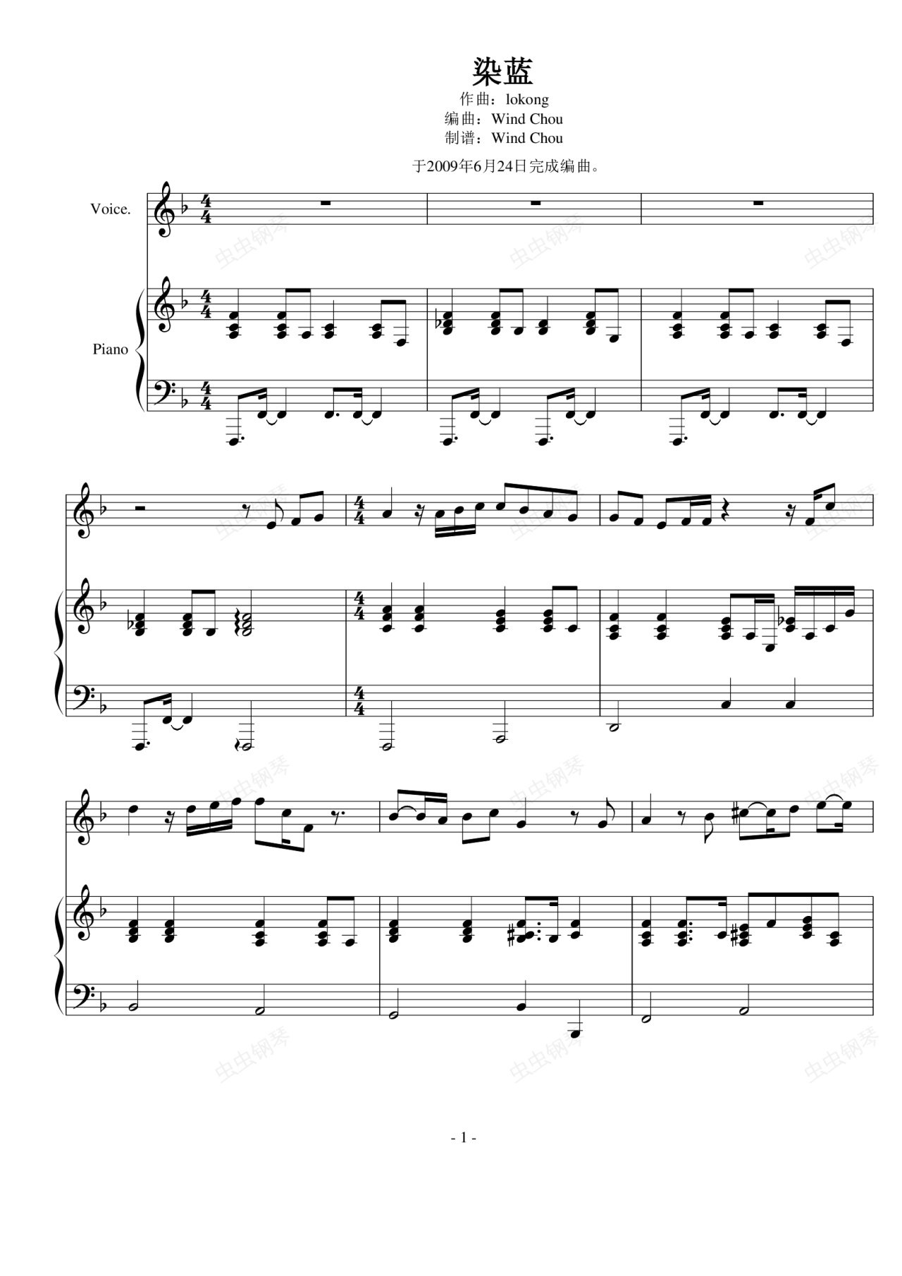 钢琴谱:染蓝(lokong作品,WindChou编曲)