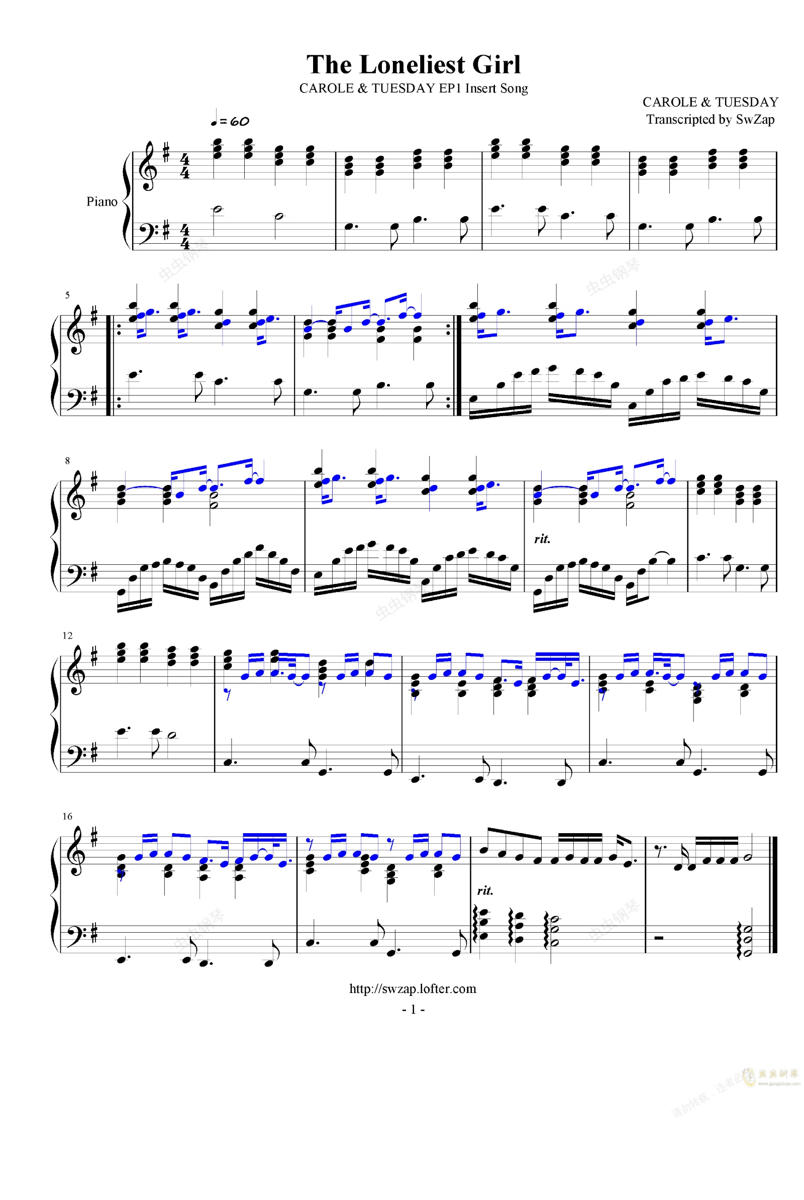钢琴谱:“The Loneliest girl” (《卡罗尔与星期二》第一话插入曲)
