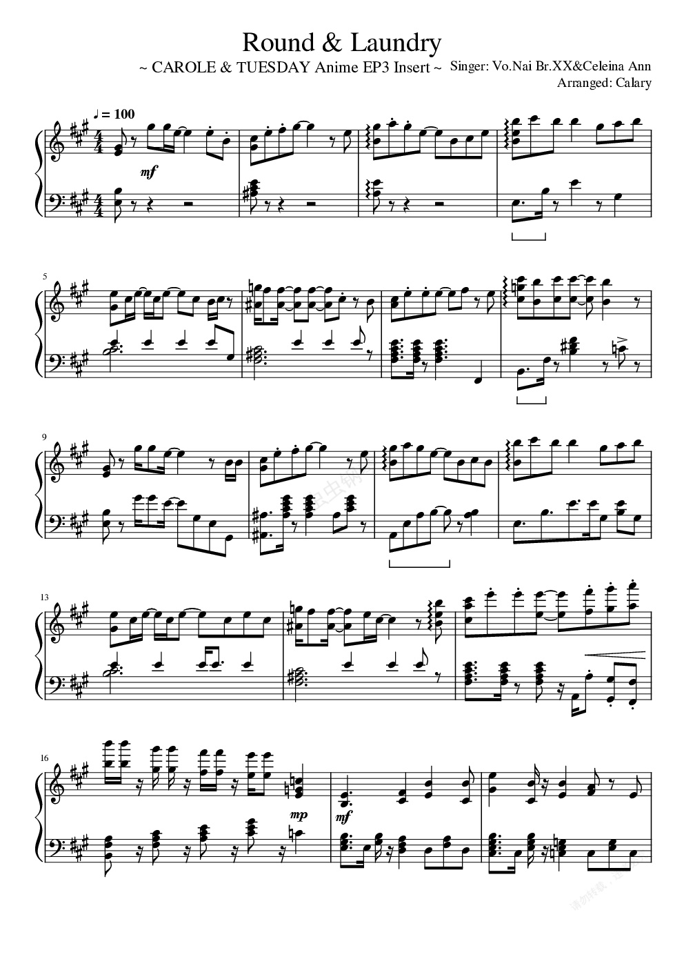 钢琴谱:CAROLE&TUESDAY - Round & Laundry