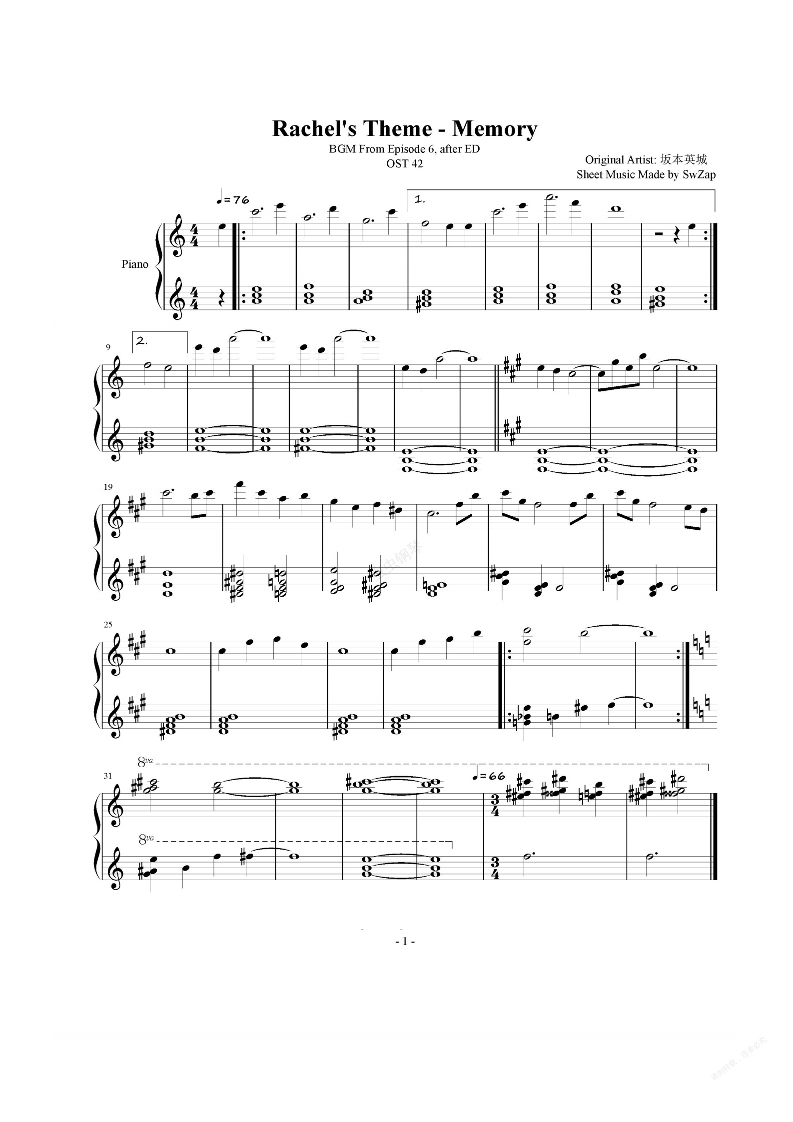 钢琴谱:Rachel's Theme - Memory (《杀戮的天使》OST 42)