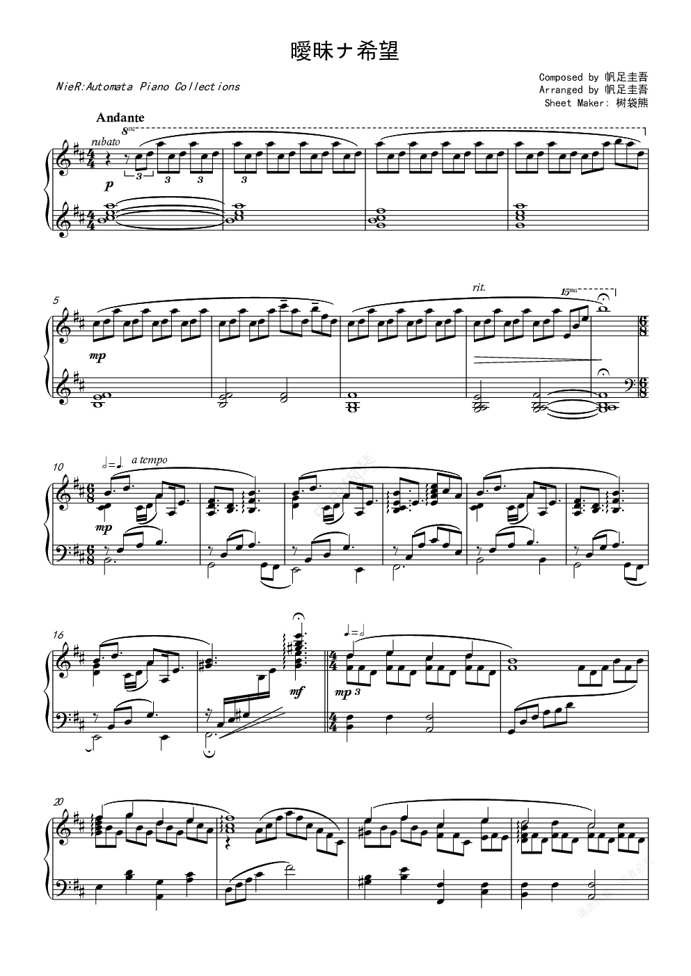 钢琴谱:【尼尔机械纪元】曖昧ナ希望
