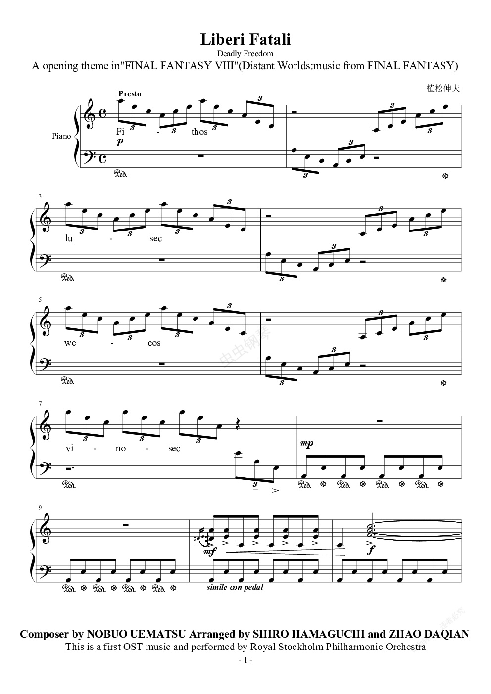 这首歌曲,是日本电玩游戏《最终幻想VIII》(FINAL VIII)中的开场音乐,歌名为《》,系拉丁语歌曲。意为“命运之子”,另名为“致命的自由”。由植松伸夫(Nobuo)作曲。据说该歌曲与后来的《Eyes On Me》都被选成了《最终幻想VIII》中的主题曲。下面是具体的歌词。 lusec wecos. lusec wecos. lusec wecos. vos e mei cunae sunt vos e , est non!!! verna. urite mala .. lusec wecos. lusec ...... Ah...... Ah............该歌曲原先收录在《最终幻想VIII》的原声音乐专辑中。鉴于如上歌词内容,为野岛一成()所作。我们的这首钢琴曲,是根据2009年发行的第一张《最终幻想音乐精选集》(:music from FINAL)中收录的版本改编的。既很有气势,又充满热血,但是编曲者是日本著名的音乐人——浜口史郎(Shiro),演奏者是斯德哥尔摩皇家爱乐乐团(Royal)。该专辑也成了全世界以《最终幻想》系列为主题的广为流传的交响乐专辑。