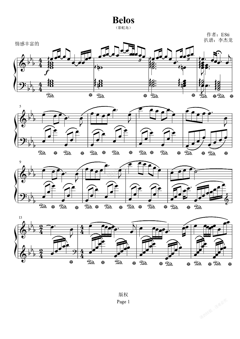 钢琴谱:Belos(彩虹岛-贝罗斯)