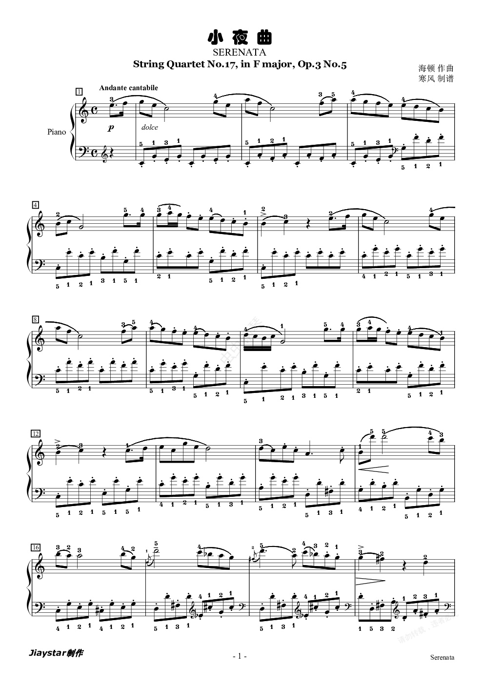 钢琴谱:海顿小夜曲-如歌的行板(附指法)