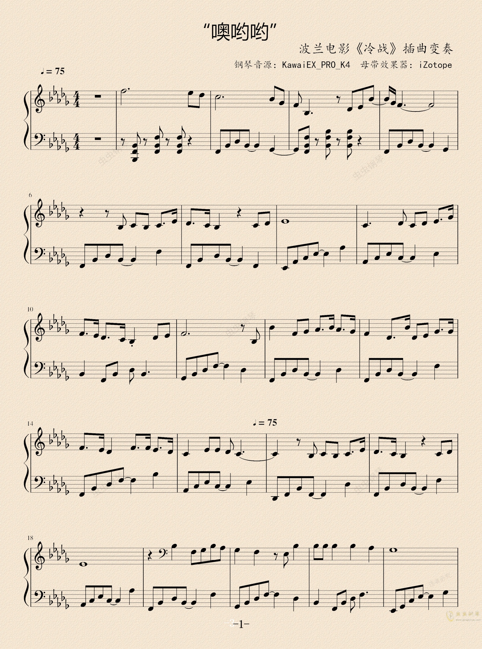 前天晚上,很偶然看了这部很冷门的波兰电影《冷战》,一下子被里面的插曲“噢哟哟”吸引,不知为什么,该曲的音调很有一点“中国风”的味道,而且非常好听!忍不住把它改编成了钢琴曲。当然跟原曲相比味道变了很多。十分推荐大家去看看这部黑白片,尤其是摄影爱好者,你一定收获多多!