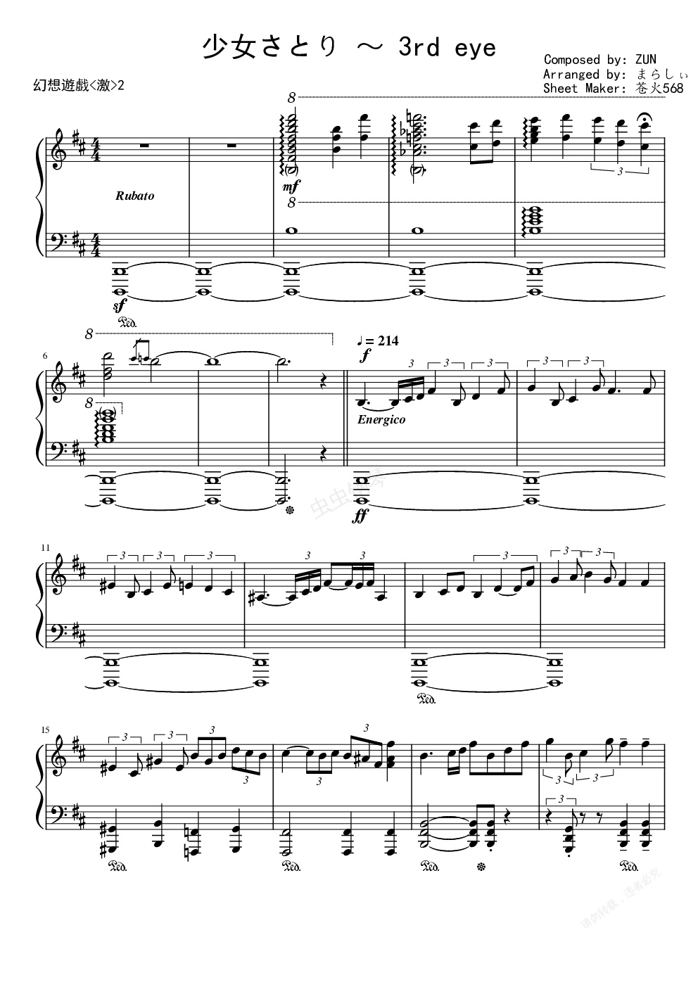 这次的谱子是触手猴的专辑 幻想游戏<激>2 中的主打曲 少女さとり ~ 3rd eye 的钢琴谱 原曲出自 东方地灵殿 四面BOSS 古明地觉 的主题曲  趁着实习摸鱼摸了一张出来 这专辑果然都是抖腿神曲 乍一听挺简单的 结果还挺费事 就酱