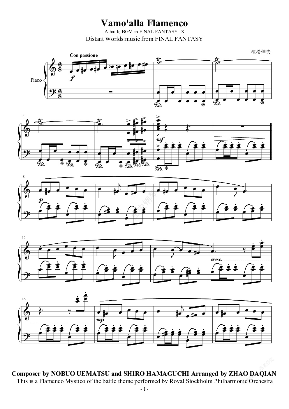 日本著名游戏业霸主史克威尔·艾尼克斯公司( Co.,Ltd.)的游戏《最终幻想IX》(FINAL IX)的主题曲这首歌是由日本的著名游戏音乐人植松伸夫(Nobuo)所作的,充满斗志和热血的弗拉门戈舞曲。后来被浜口史郎(Shiro)改编成交响乐版本,并收录在《最终幻想音乐精选集》(:music from FINAL)中。据说该歌曲在《最终幻想IX》中,是以“陆行鸟挖宝”为场景的音乐,也有浜口史郎改编的钢琴曲。本人根据交响乐版本改编成钢琴独奏版本。