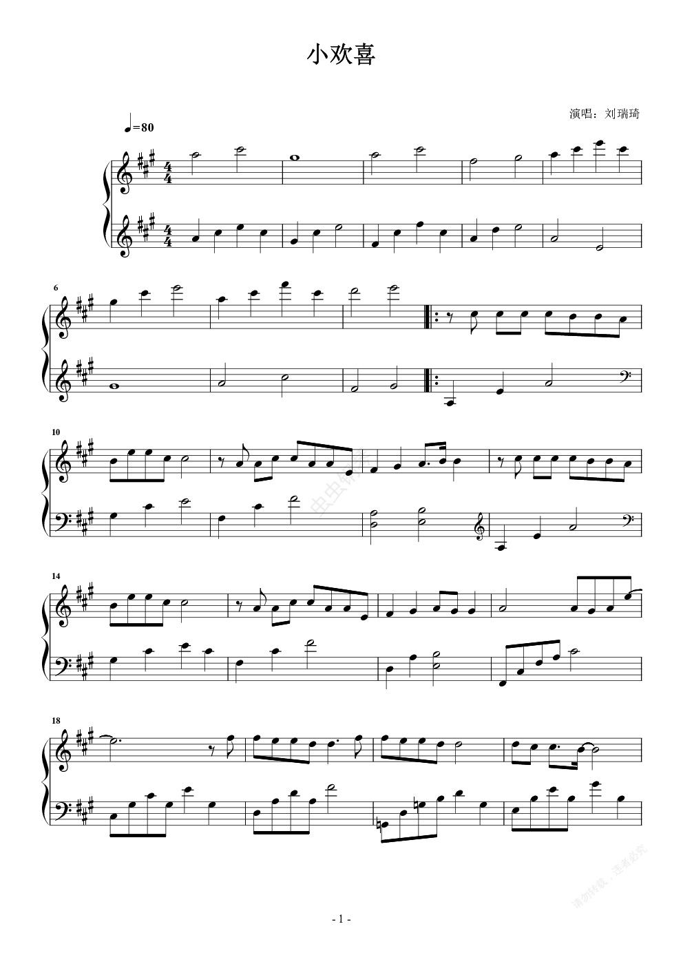 钢琴谱:小欢喜 刘瑞琦