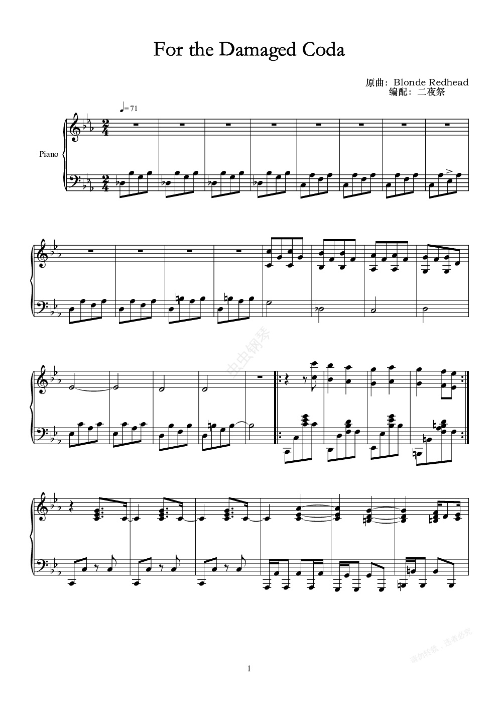 钢琴谱:【瑞克和莫蒂】For the Damaged Coda【Blonde Redhead】