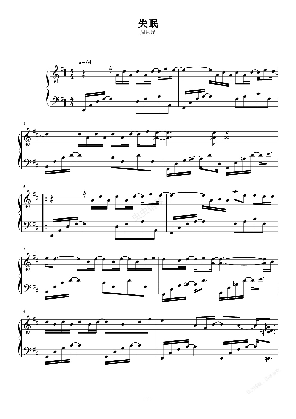 钢琴谱:失眠 周思涵