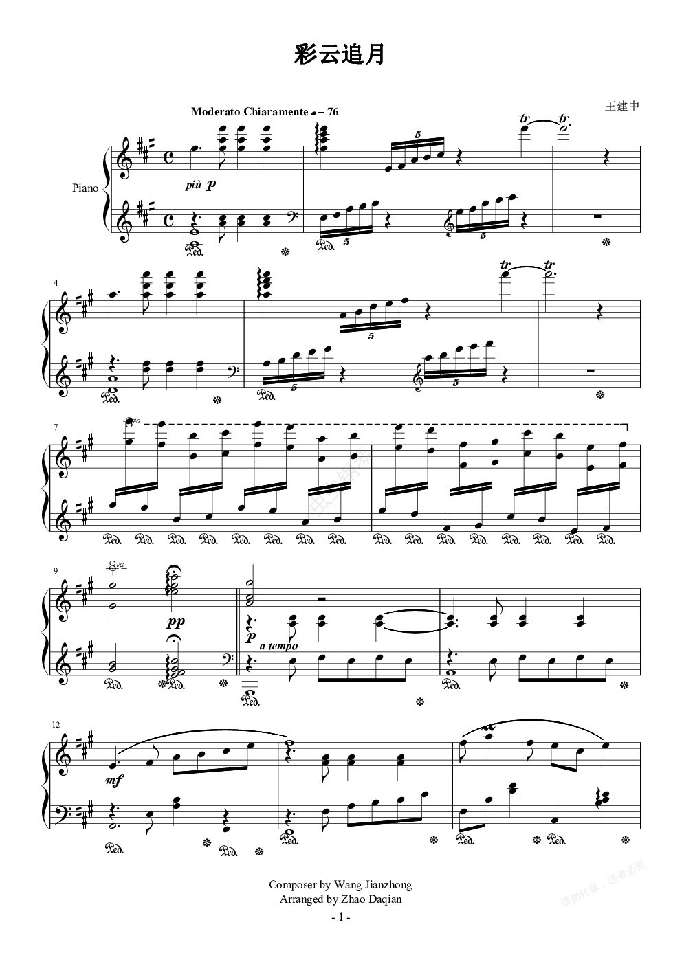 《彩云追月》早见于清代,系著名的粤音曲谱,其风格轻快独特,描写了小市民平凡生活的轻松写意,彰显了典型的广东民间音乐风格。李鸿章任两广总督时曾将此曲抄送大内演奏。任光与聂耳为百代国乐队写了一批民族管弦乐曲灌制唱片,《彩云追月》就是其中的一首以管弦乐重新编曲的优秀作品,成曲于1935年。1960年,彭修文根据中央广播民族管弦乐团的乐队编制重新配器。乐曲以富有民族色彩的五声性旋律,上五度的自由模进,竖笛、二胡的轮番演奏,弹拨乐器的轻巧节奏,低音乐器的拨弦和吊钹的空旷音色,形象地描绘了浩瀚夜空的迷人景色。另有根据词曲填词的同名歌曲。曲名“彩云追月”的寓意是仙人驾五彩祥云奔向月宫。中国古典文学著作当中常有仙人驾彩云的描述,曲名当中的“彩云”意指仙人驾彩云。这首曲子是描写人们心目中的月宫仙境。本人根据王建中的钢琴版本改编。