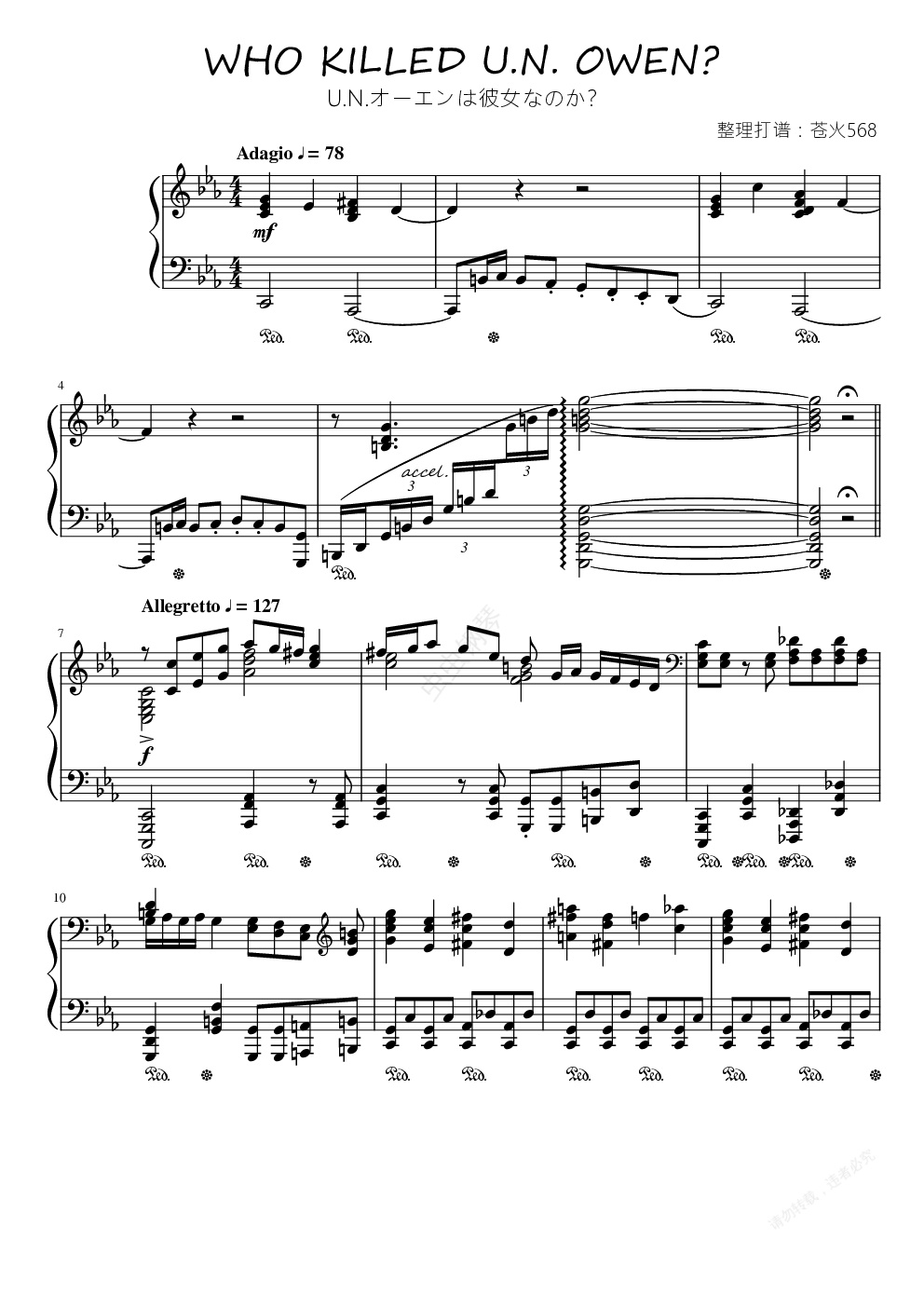 对虫钢上转载的钢琴谱做了个小整理 重新打了一份谱子 也方便自己再做修改 我也不知道原谱作者是谁 于是没标 如果知道的话我会修改的 在原谱上做了一点也不知道对不对的修改 我在乐谱中以感叹号和问号的方式标出来了 方便各位与童鞋的原版本做一些对比 就酱