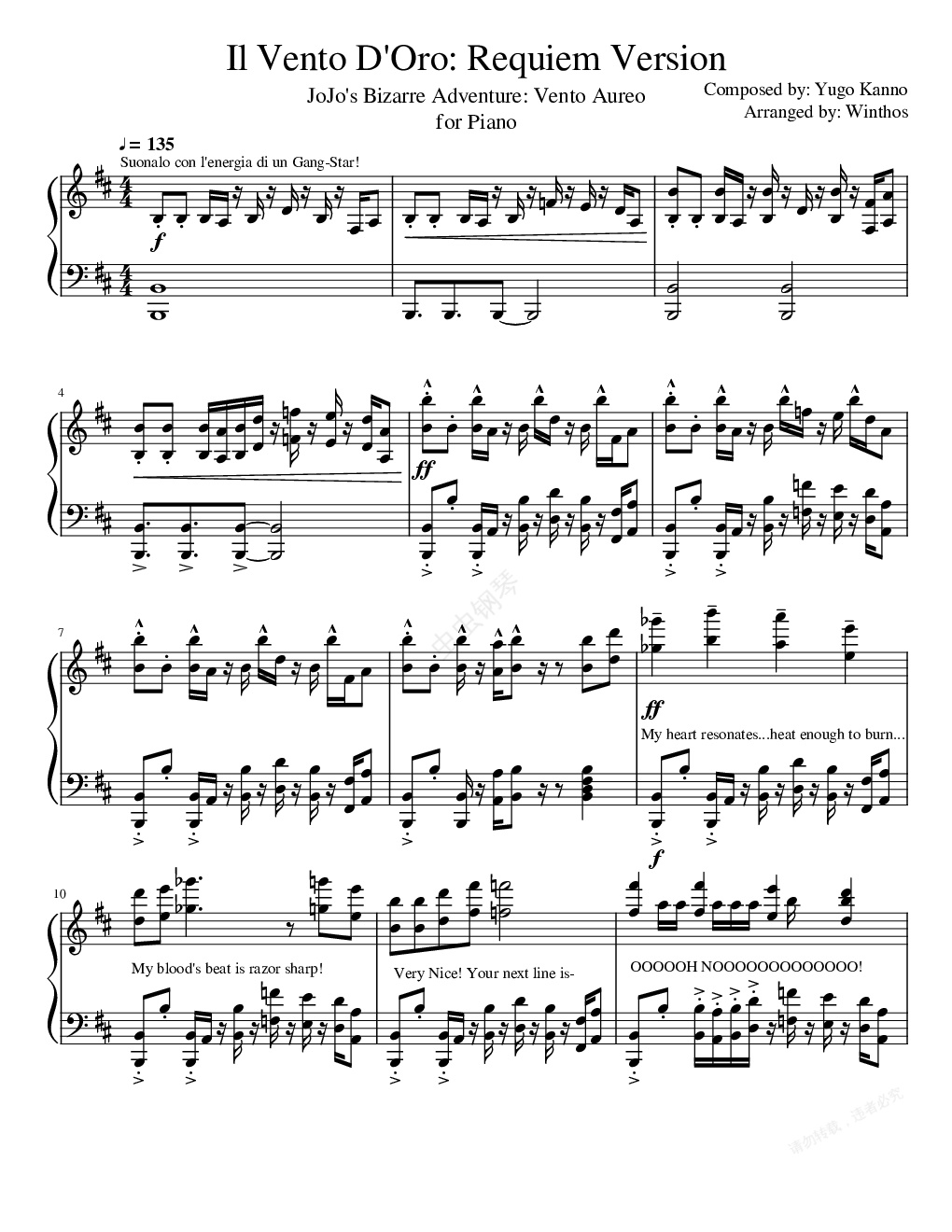 钢琴谱:【JOJO的奇妙冒险】il vento d'oro(镇魂曲ver.)