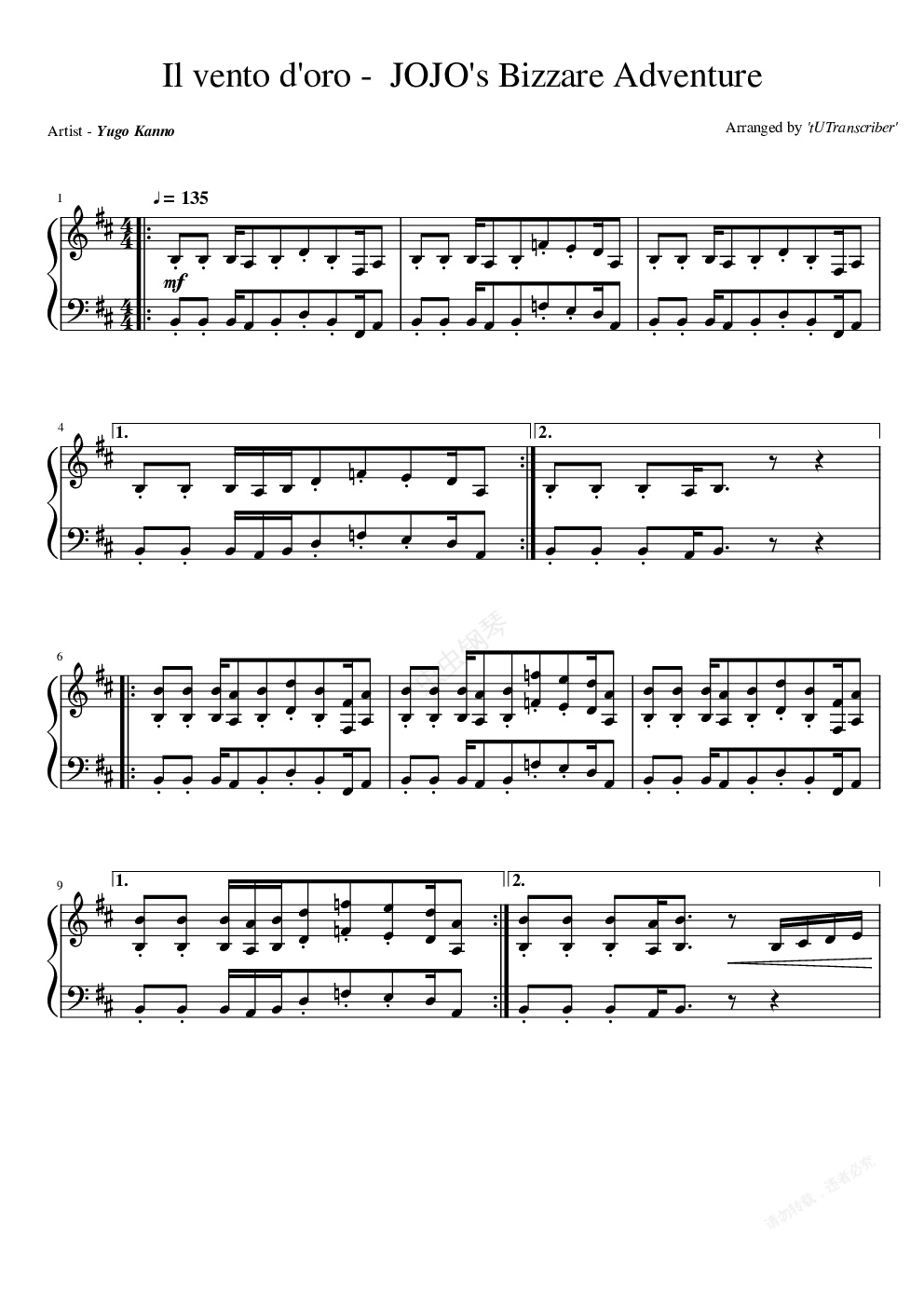 钢琴谱:【JOJO的奇妙冒险】il vento d'oro