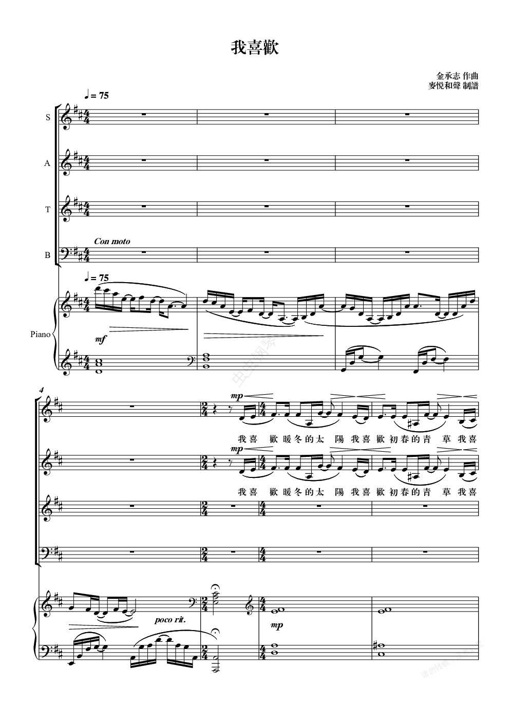 钢琴谱:《我喜欢》合唱谱
