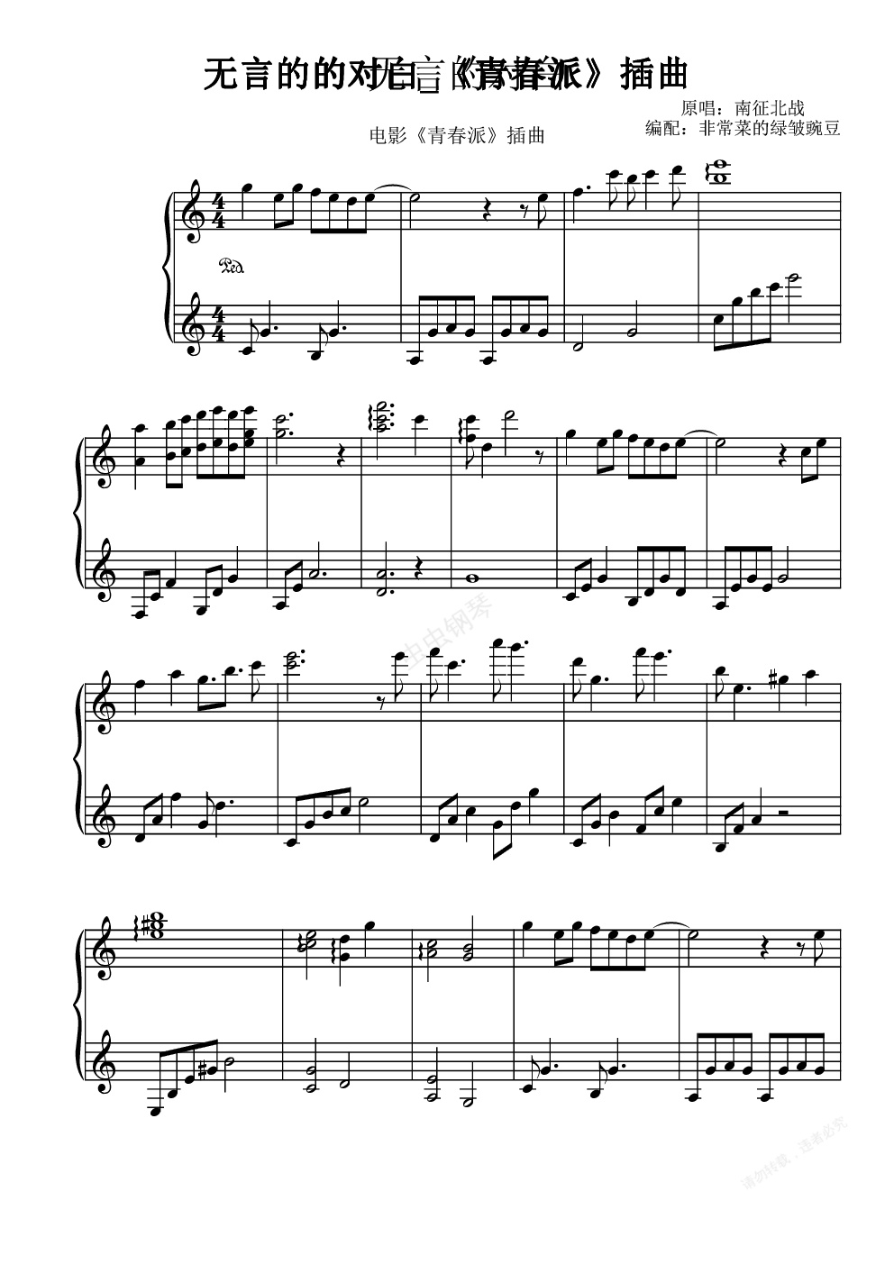 “两眼一睁,开始竞争!发卷子!扛得住给我扛,扛不住给我死扛!”“泰戈尔还说过,尽管走下去,不必逗留着,采鲜花来保存。因为一路上,花自然会继续开放。”电影《青春派》中的音乐,大家可能对《我的天空》比较熟悉,但是其中一首纯音乐《无言的对白》是真的好听,很宁静,让人想起高中时的那些时光。但是网上不太找得到它的谱子。最近感觉好好玩哦,再加上最近比较闲,就试着编配了一下。基本上是按照原曲整出来的。希望大家喜欢~