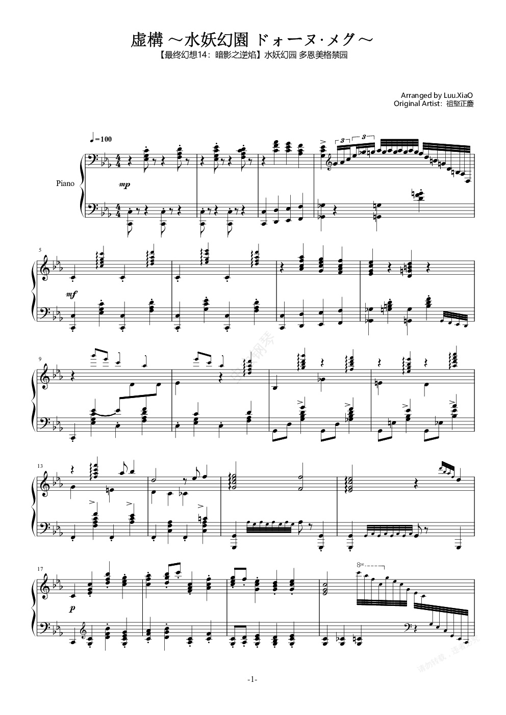 这首曲子是《最终幻想14:暗影之逆焰》的73级副本的BGM,是我在游戏排队的空档时写的~第一感觉真的很像糖果仙子之舞的,和游戏里面水妖幻园的场景真的绝配。祖堅正慶真的是鬼才,无论摇滚还是古典,什么都能写啊,大佬~~----------------------------------------------------------------------还是和以前一样,曲子部分细节是没有还原原曲~~~还有这首对力度把控的基本功还是有点要求的,希望你能演奏出我所想要的层次感吧~~~----------------------------------------------------------------------钢琴音源 piano 下载地址:/s/1