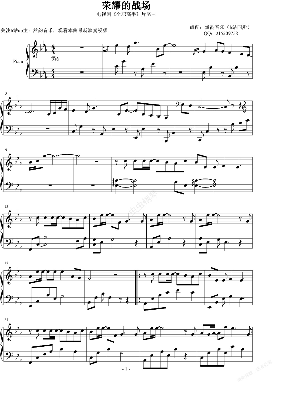 钢琴谱:电视剧《全职高手》片尾曲 荣耀的战场