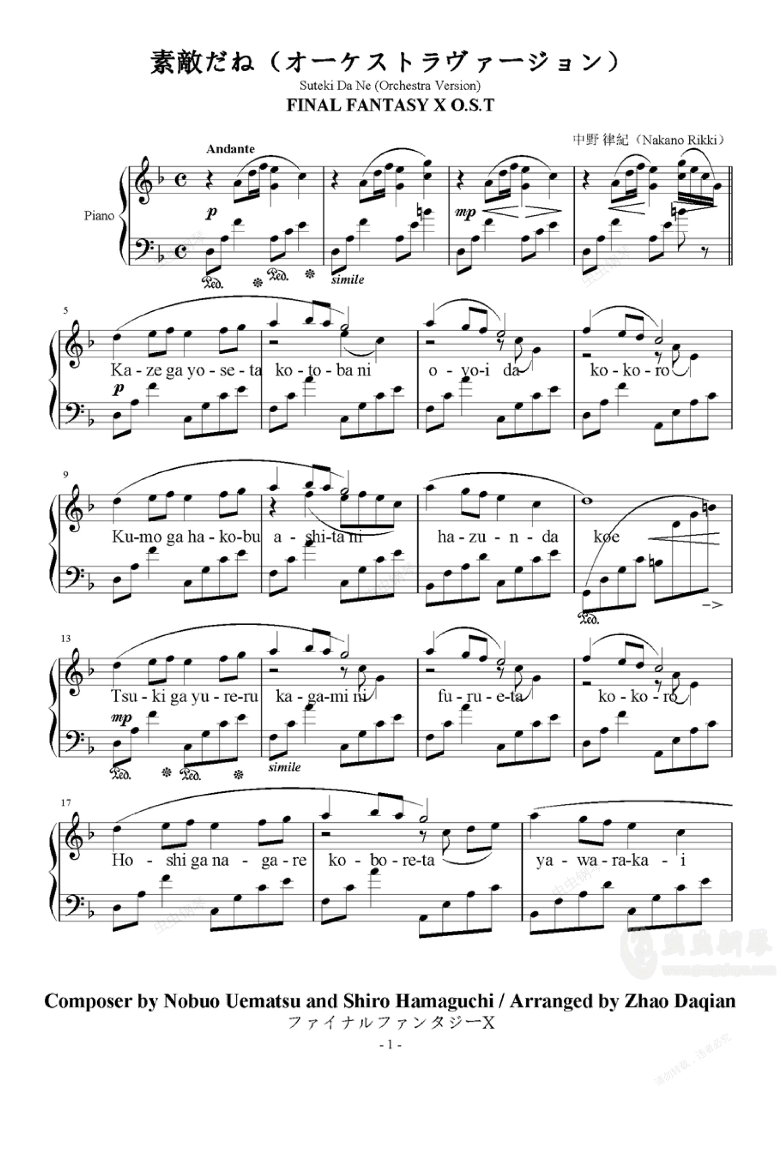 游戏业霸主史克威尔艾尼克斯公司( ENIX Co.,Ltd.)的当家巨作《最终幻想X》(FINAL X)的主题曲改编自《最终幻想X》原声交响乐版本(最后一首歌)作词:野岛一成作曲:植松伸夫演唱:中野律纪( Rikki)風が寄せた言葉に 泳いだ心雲が運ぶ明日に 弾んだ声月が搖れる鏡に 震えた心星が流れこぼれた 柔らかい涙素敵だね 二人手をとり歩けたなら行きたいよ 君の街家腕の中その胸 からだあずけ宵にまぎれ 夢見る......風は止まり言葉は 優しい幻雲は破れ明日は 遠くの声月がにじむ鏡を 流れた心星が搖れてこぼれた 隠せない涙素敵だね 二人手をとり歩けたなら行きたいよ 君の街家腕の中その顔 そっと触れて朝に溶ける 夢見る()素敵だね 二人手をとり歩けたなら行きたいよ 君の街家腕の中その胸 からだあずけ宵にまぎれ 夢見る......