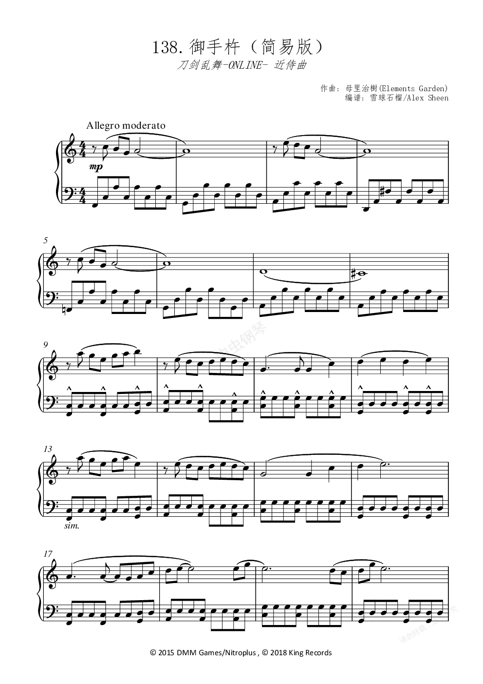 钢琴谱:御手杵 近侍曲 【刀剑乱舞】(简易版)