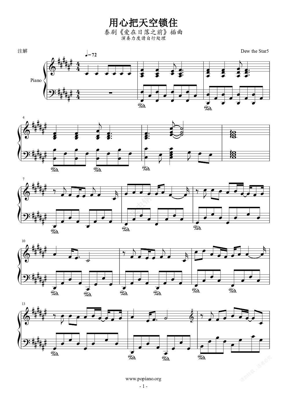 钢琴谱:用心把天空锁住(泰国电视剧《爱在日落之前》插曲)