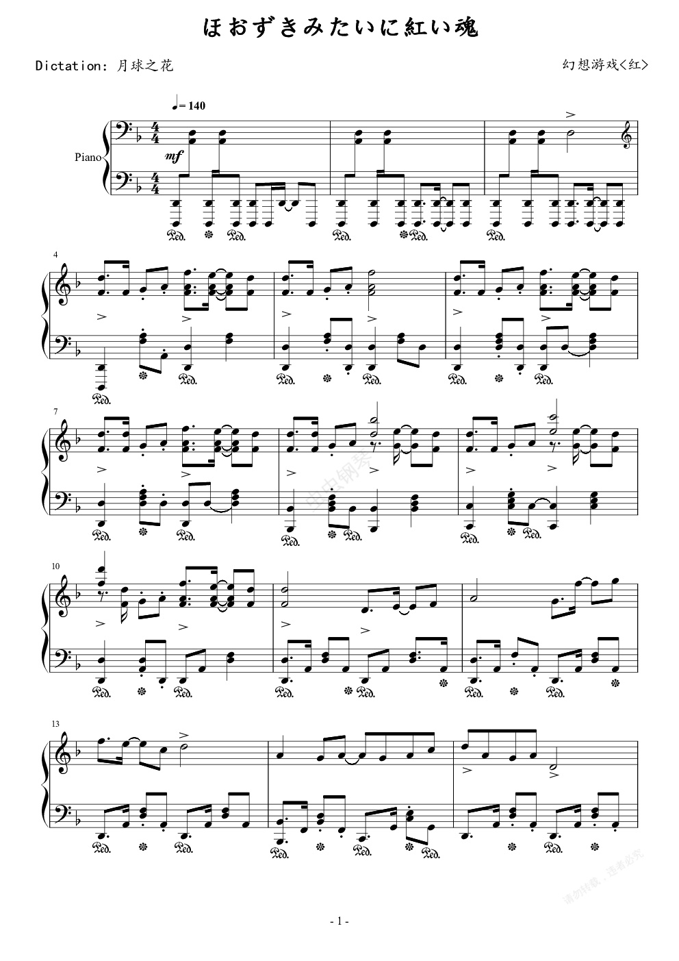 《如鬼灯般的红色之魂》有天我脑里突然播起了这首曲,不知不觉引起了我的注意,觉得挺有趣的,所以就扒了。虽然这是猴子早期作品,但无论编曲和演奏上都还是暗藏了许多精妙之处!例如12小节左手高音第一次是单音F,从第二次起才开始双音,这样能让主题干净地出现,开了个很好的头,恰到好处,比起一开始就用双音,这种音响实在是很舒服很令人满足;第15小节的第一个踏板踩在第14小节最后一个音上,虽然表面看好像是踏板失误,但这样短短浑浊一下恰好起到了小渐强的作用(可惜音效不如意);49-50小节的踏板正好配合了渐强减弱。正因如此我这次才好好做了踏板记号。还有旋律的连断也正合人意。钢琴音色简单爽脆,很有年代感,正适合弹早期东方曲,因此我也用了音色比较简单爽脆的音源来录音效。