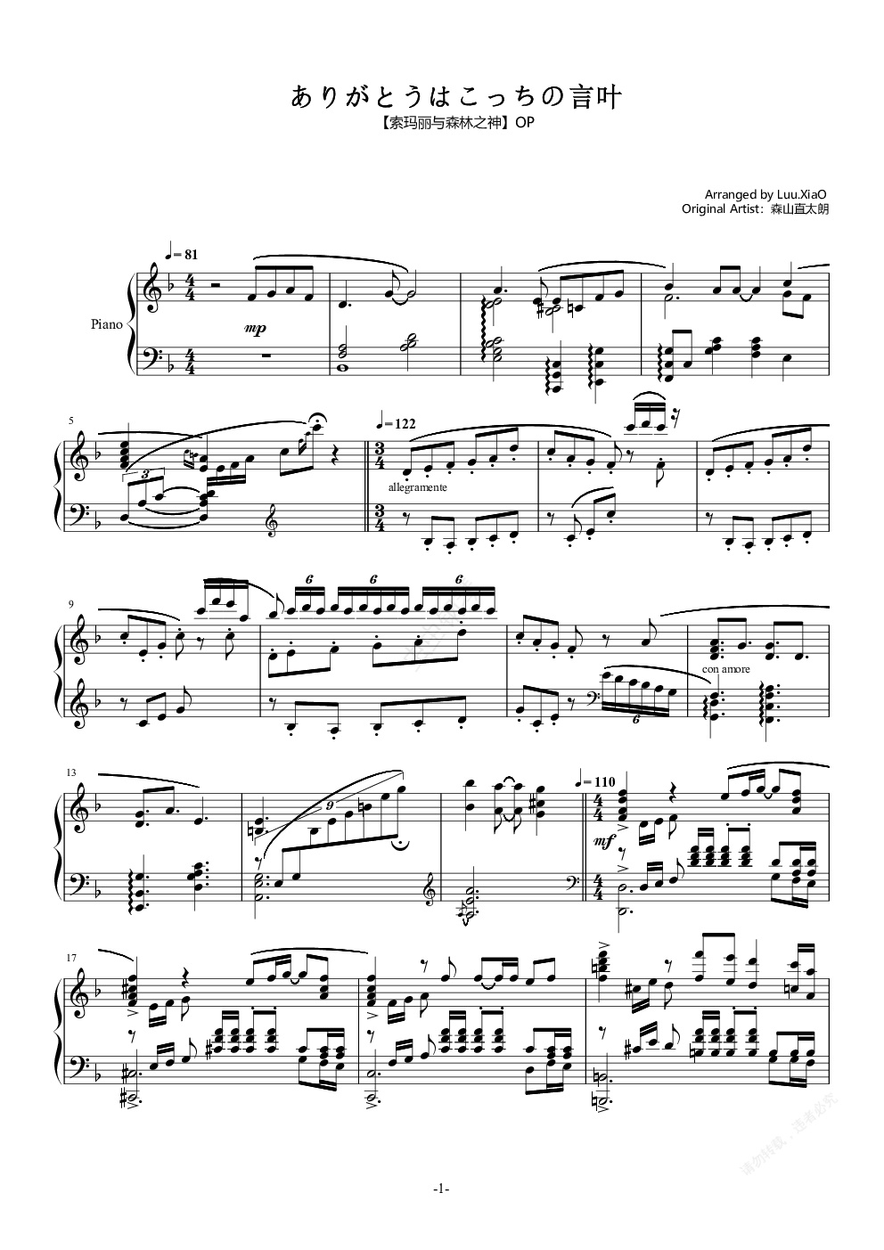 好久没改编动漫钢琴了,翻了翻最近6个全是游戏音乐。所以这次是一月新番【索玛丽与森林之神】的OP改编,看了第一集感觉这是个十分治愈(致郁?)的番,画风很喜欢,配乐也很棒,强推一波~---------------------------------------------------------------------------这次是还原向改编,所有细节尽可能还原原曲,还好这首曲子声部丰富,织体和声改编起来都没什么困难~~但是难度嘛~哈哈,应该不算太难的,大家量力而行吧---------------------------------------------------------------------------钢琴音源 piano 下载地址:/s/1