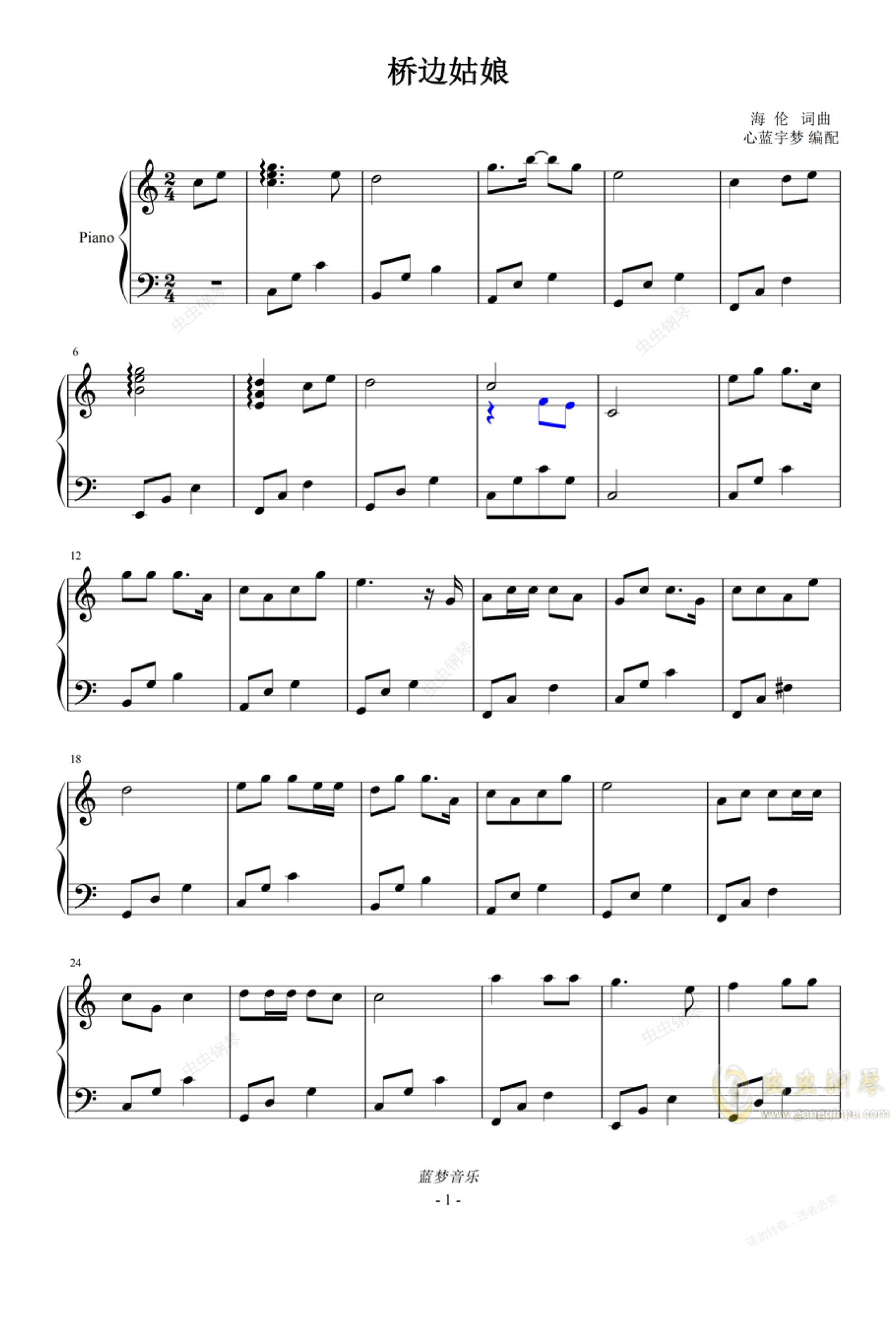 《桥边姑娘》是由海伦作词作曲并演唱的歌曲。属于流行、民谣风格。在编配时力求简单,便于初学者以及喜欢这首歌曲的钢琴爱好者参考、演奏,因此我没有按照原调编配,而是改成了C调,同时为了使该曲更加好听,在编配时才用了多种伴奏音型,包括主旋律的一些改编。