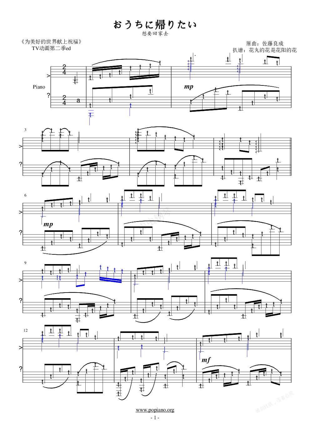 钢琴谱:【经典番】为美好的世界献上祝福第二季ed~想要回家去(おうちに帰りたい)