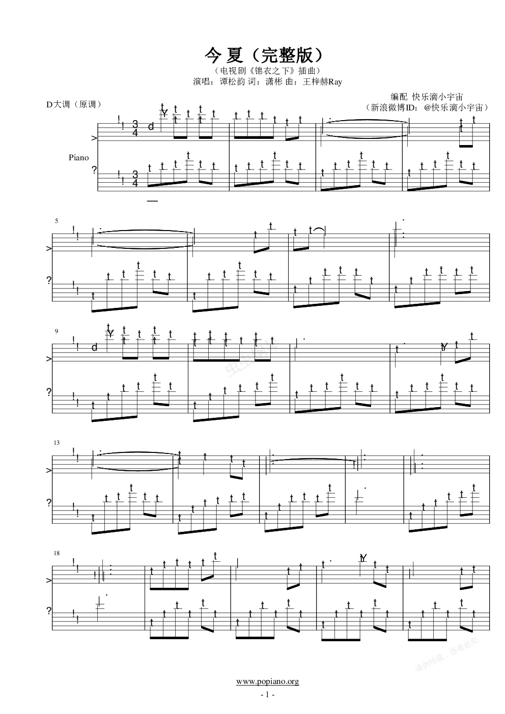 虫钢的第一首自扒谱作品献给《今夏》了!非常喜欢剧中插曲《今夏》这首歌,太上头,好久没有这么单曲循环过一首歌儿了!也是一首能勾起演奏欲望的曲子啊!看到好多网友求谱,我用软件做了谱子,野路子非专业,扒谱真是拼了半条小命啊,听音制谱花了2个全天(加晚上),好艰辛…尤其是转调后的这个间奏。1.我非专业,手边又没琴,一边打谱一边脑中盲摸键盘,感觉指法还算顺手,可能有的地方有点别扭,大家完全可以怎么顺手怎么弹,尤其是和弦只要根音对了即可。2.每种乐器都有它的局限,我水平有限,手头没琴,额,因此原编曲丰富的声部(主要声部就有弦乐组、箫、钢琴、吉他四种之多了)我只能是尽力呈现啊!3.此音频是C调,谱子是原调D大调改过来了。欢迎大家拍砖!好想看到有网友用真钢演奏一下呢!