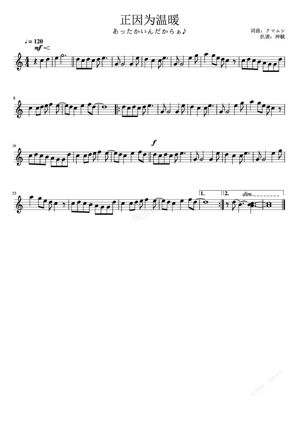 钢琴谱:正因为温暖あったかいんだからぁ