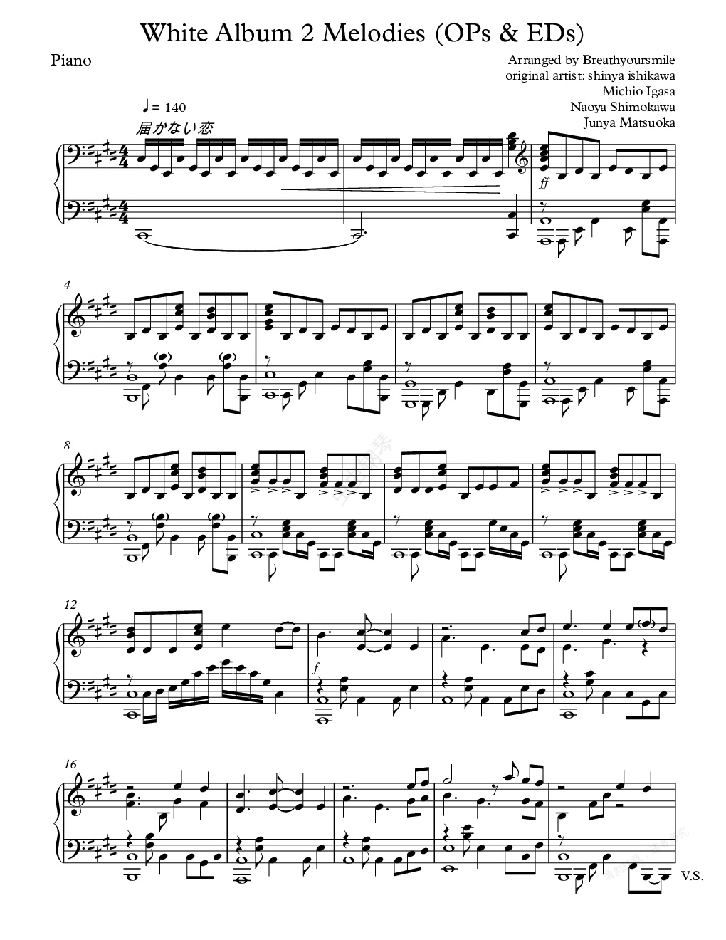 Hello 大家,真的是很长一段时间没有更新了。从去年上学期开始学习的内容开始慢慢堆积起来了,又加上开学牺牲一台笔记本,原本编好的很多谱子还没有来得及备份便流失在了硬盘的尘埃里了。于是这一段时间有了很长一段间歇期,其间偶然接触到了白学,然后便成功入坑WA2 2333。WA2 通完之后真的挺感动的,当然,UP也是相对更偏向女主中的其中一位,详情可见组曲最后1首或简介最下方。white album 2里面好的曲子实在是太多了,通完所有线后也依然无法舍弃其中的很多曲子,于是便有了这一份组曲编配。这份编配可以说是我所有编曲技巧的一个汇总,从第一次尝试编曲,到,再到现在这份完成的谱子,想想还是挺感慨的。现在回看当初编的第一首曲子a不管是还原度还是织体都太简单了,不过如果没有那第一次编配也不会有这一份完成的谱子,所以得感谢这中间所有人及二次元的陪伴。关于编配的细节:总体难度是目前所有编曲的top 5,所以之前同样提到的相遇天使暂时被挤出top 5了。不过难度都集中在第二首和最后一首,其它的曲目难度中等。难度最高的2首有大量的轮指,音阶及分解琶音,同时也需要一定的双手协调性。愿意练习的可以尝试,我也在慢慢练习这份谱子。然后最后,这份谱子是献给生日的,本来虫钢过审慢,所以过了2月14号,不过也还是可以来一些白学语句:白色相簿的季节就快要过去了~。最后希望大家都能在疫情面前保持健康。以上
