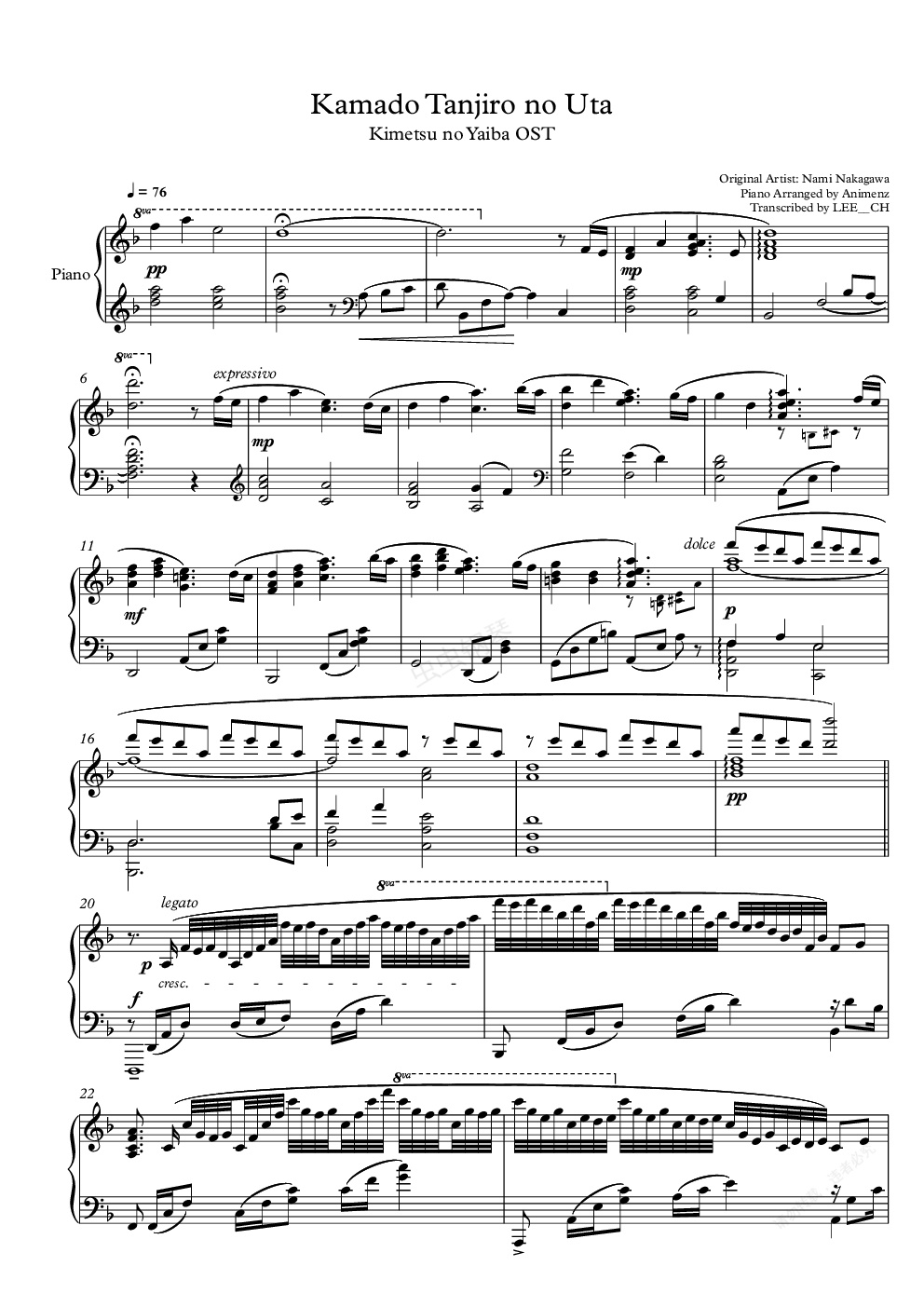 扒谱(/)//p1制谱 no Uta - no Yaiba [Piano]谨以此作献给所有的观众朋友们,长久以来鼎力支持的粉丝们!提前庆祝 100万粉丝关注达成!大家好久不见。在过去的几周内,我一直在追番(之前积压的),鬼滅の刃在观看列表中待的时间最长。我不得不承认的是,我到现在仍然对片头曲红莲华(LiSA演唱)没什么感觉,但我真的很喜欢19集中,超赞的绝境对决场景所播放的插曲,我们熟知的灶门炭治郎之歌。而后当我去听了完整版,却大吃一惊。这曲子是出乎意料的长,有很多重复的元素,在小调和大调两个风格迥异的主旋律中,找一个好的平衡点用钢琴表现出来,也相当困难。我试图为副歌的重复找到合适的变奏,但我就是没法拿出一个达标的选项。这就是为什么我决定稍微改变一下歌曲的结构。通过省略掉第二段,并在最终副歌之后,加入一个新的结尾部分,我既保留了整首歌的长度,又避免了太过重复。此外,我觉得原曲副歌结束的有点太突然了。5分钟内的所有情绪积累,一瞬间宣泄殆尽,然后归于虚无。我曾有几分期许在旋律层层递进之后,会有个尾声什么的(或许我只是习惯于音乐中有“收笔”的元素)。归根结底,我的每一首钢琴编排都力求做到张弛有度,从而创造出一种“自然”流淌的音乐。我希望我这次届到了。好吧,那我又要补番去了,然后无论哪首曲子,如果我听到觉得比较抓耳,我就来改一改。