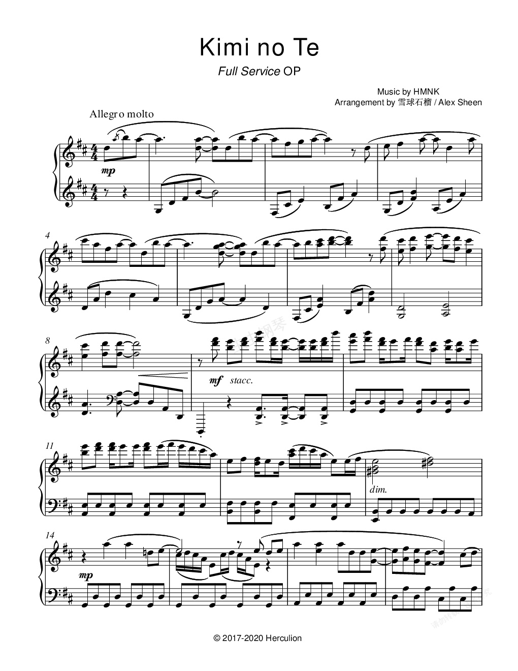 钢琴谱:Kimi No Te【Full Service】主题曲