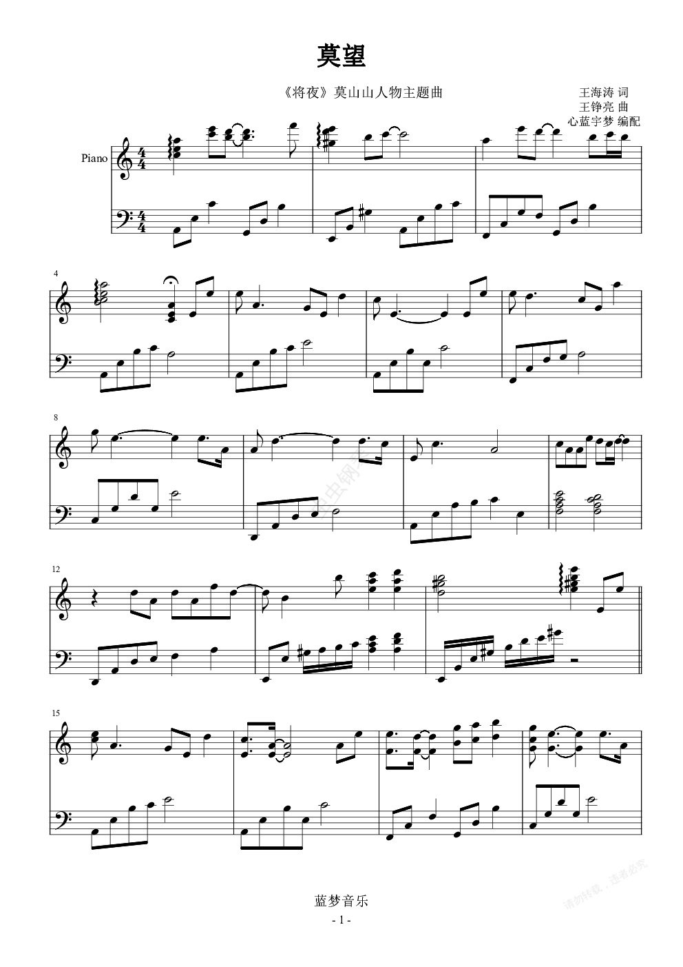 《莫望》是电视剧《将夜》莫山山人物主题曲,由王海涛作词,王铮亮作曲,刘美麟演唱。在编配的时候没有设计得太复杂,副歌的左手有连续十六分音符的琶音快速跑动,稍加练习就可以弹下来了。