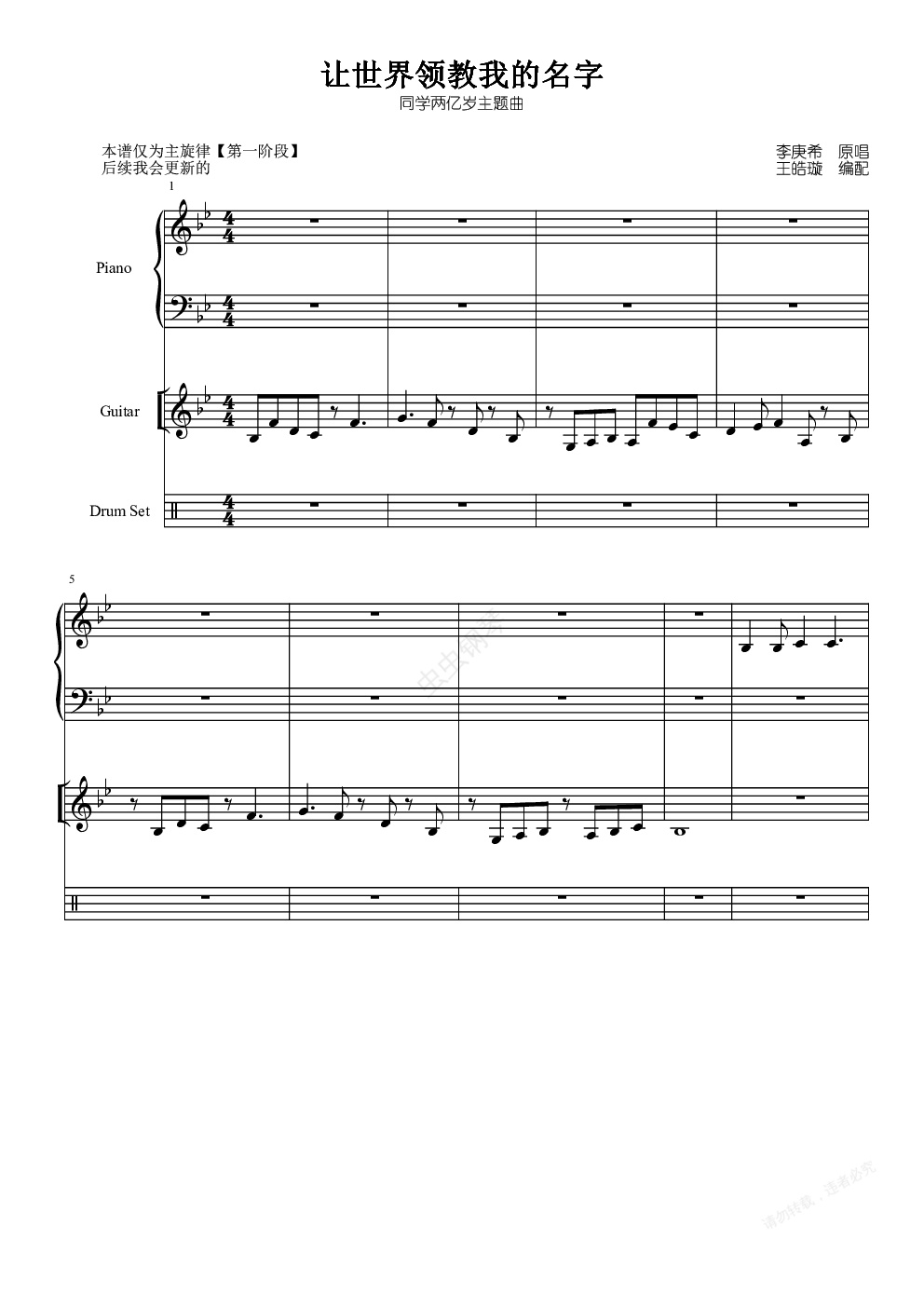 钢琴谱:【同学两亿岁】让世界领教我的名字(第一期--主旋律)