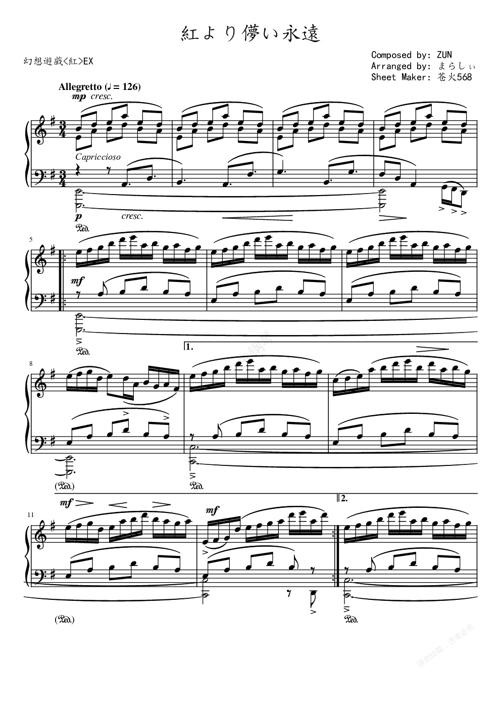 东方红魔乡曲 出自触手猴 幻想游戏<红>ex其实第一次听到这曲子是在月神夜的(又写了许许多多的记号 在软件里看起来挺乱的 打出来pdf看起来效果还行 弓箭太有意思了 谁还玩太刀啊[IMG]/pu/2020/3/5/__3961__[/IMG]就酱2020.3.9没有找到猴子的视频 所以根据自己的指法尝试做了一下标记 修改了45,46及类似小节的连音线