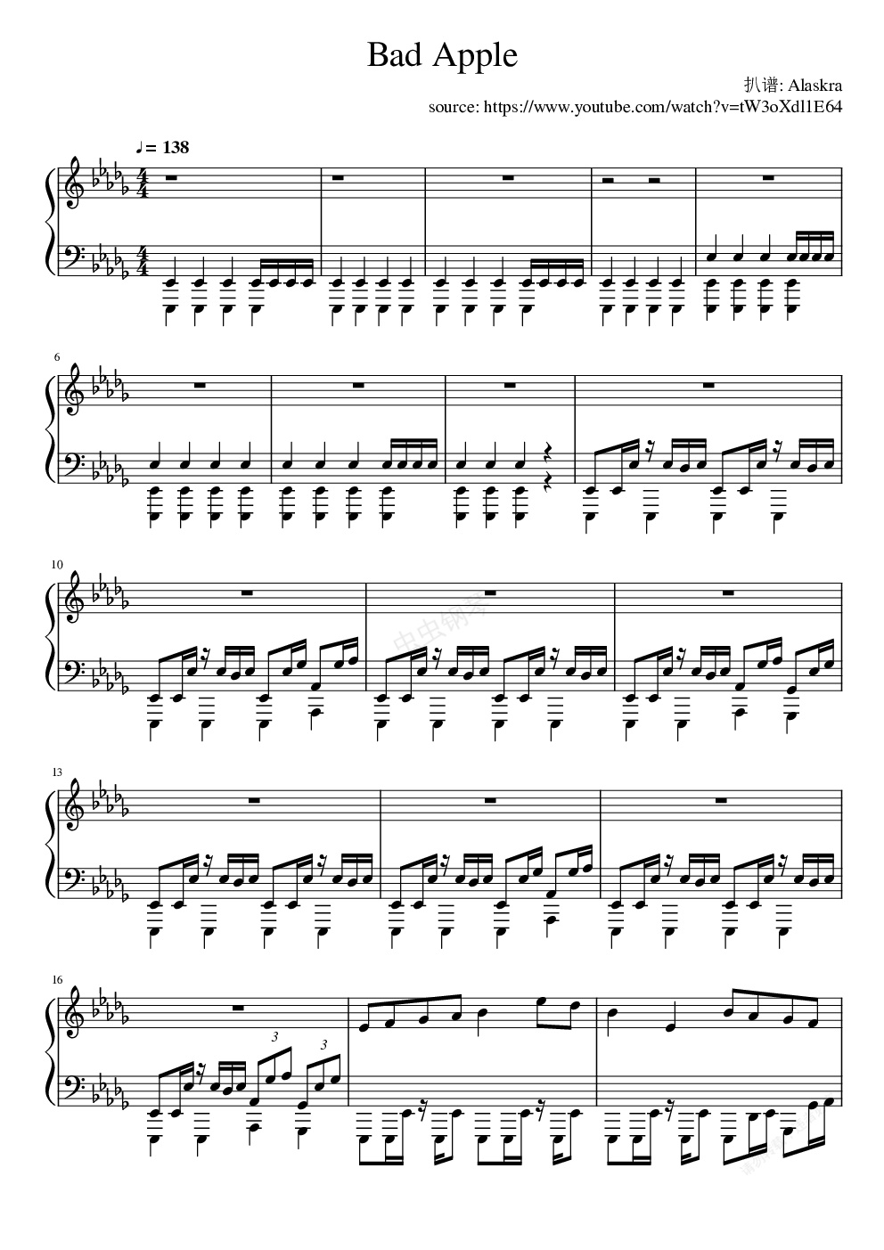 不是东方粉,但特别喜欢这首Bad Apple特别喜欢这个来自油管的版本/watch?v=,节奏很带感网上没有这个版本谱子,于是自己尝试扒谱这是我第一次尝试扒谱,请多指教(*^_^*)