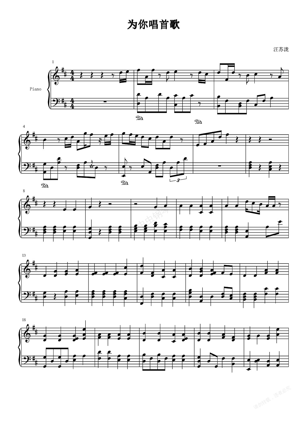 钢琴谱:汪苏泷《为你唱首歌》弹唱版