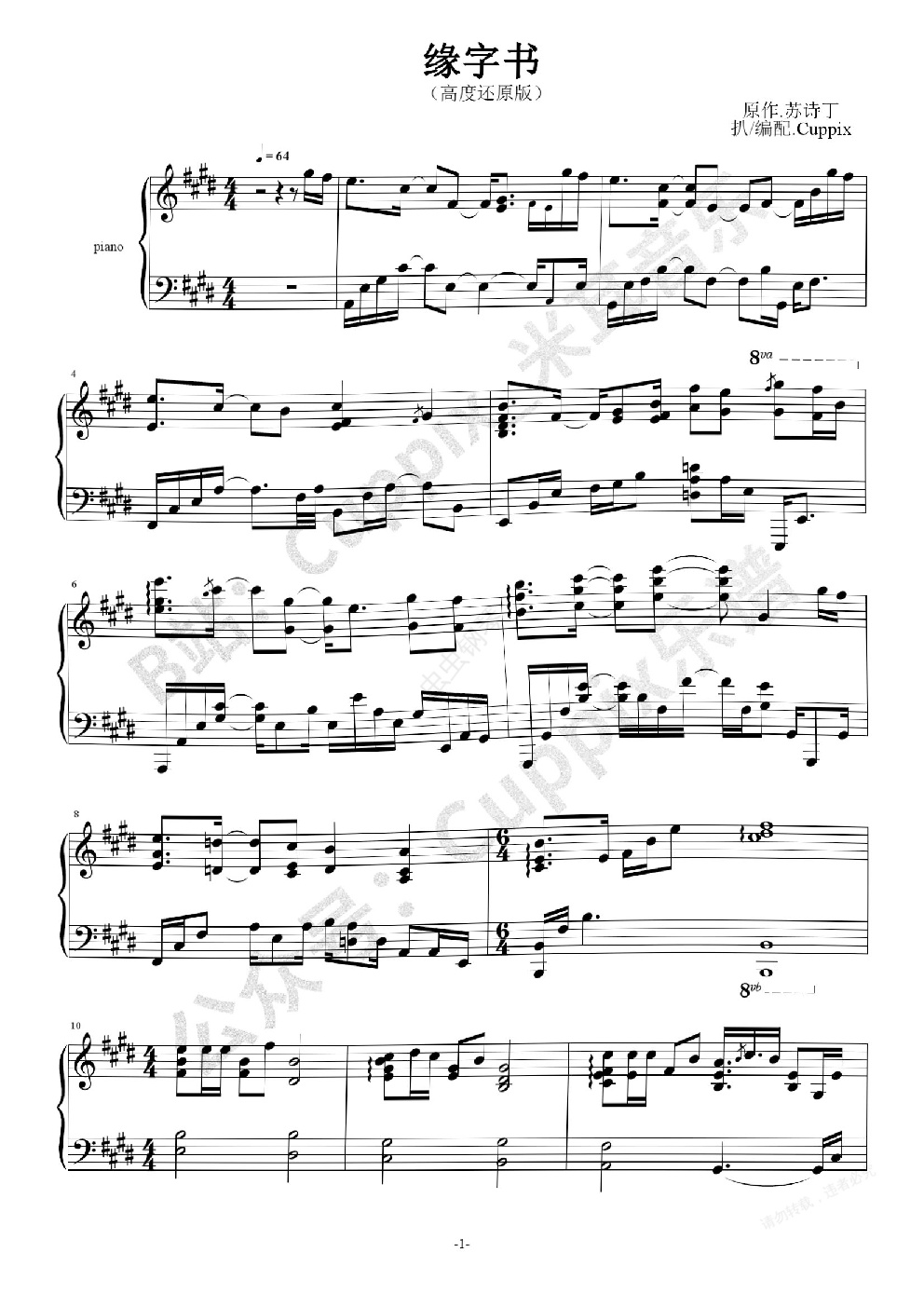 谱面有做一定扭曲处理实属无奈之举,可以关注公众号【乐谱】获取更加高清的PDF文档。B站米耳音乐。欢迎大家多多关注,有新作会第一时间更新。低价接扒谱制谱,Q.