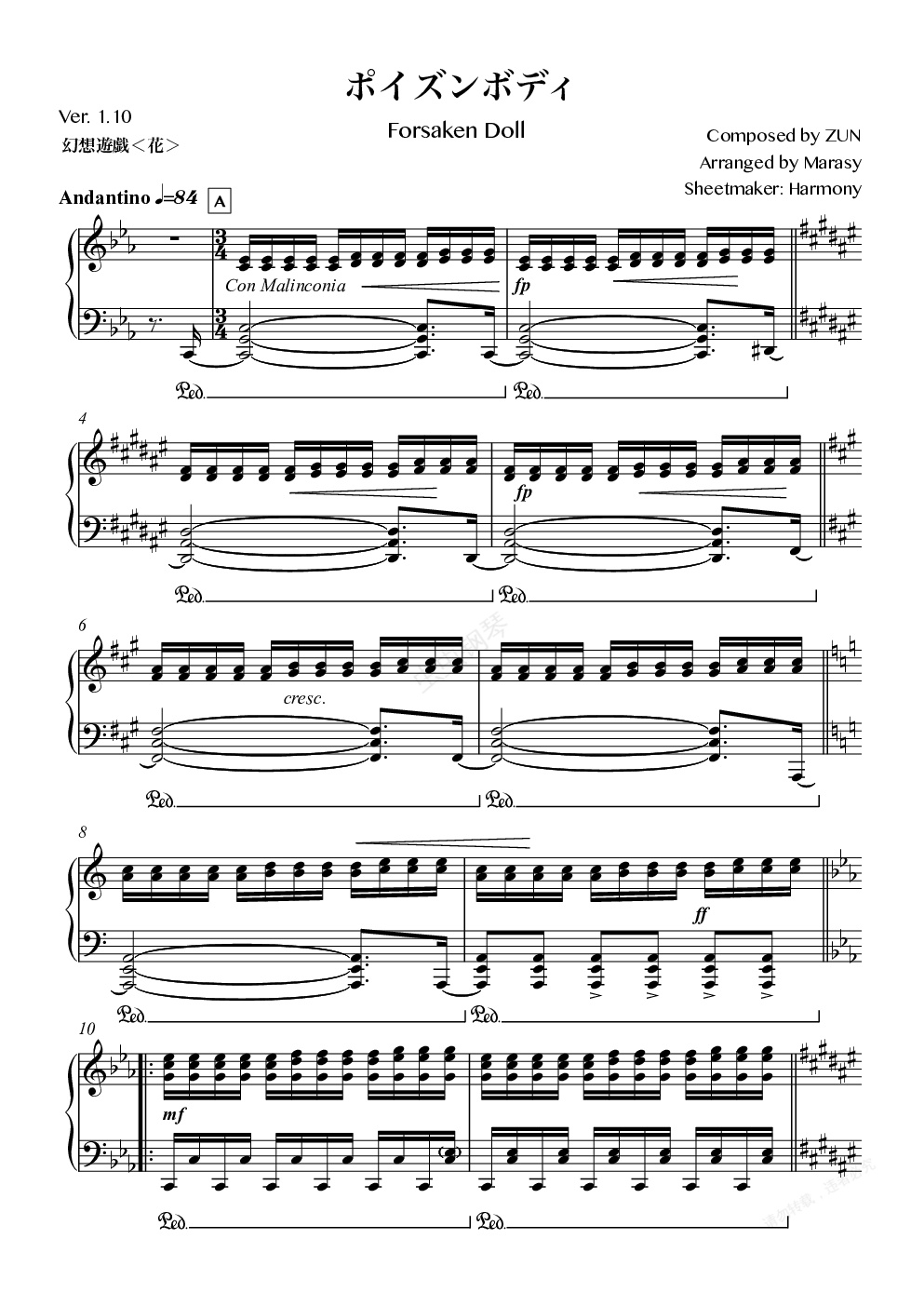 大家好,这里HX花映冢、幻想游戏<花>补完计划第一弹《毒之身~ Doll》(又译:《剧毒身体》),是东方花映冢出场自机、敌机梅蒂欣·梅兰可莉()的角色曲,发布于2005年,原作者上海爱丽丝幻乐团。这次带来的是触手猴收录于专辑《幻想游戏·花》的钢琴版本。希望大家喜欢。*特别注意 本曲织体野蛮至极 慎弹 慎弹 慎弹*花映冢Music Room·季候音樂室曲评梅蒂欣·梅兰可莉的主题曲。 花映塚之中最富异色的曲子, 因为有点西洋风而尝试了带有阴暗想象的创作。 煽动起奇妙高扬感的BOSS风格的曲子, 喷涌出令人怀念的街机游戏的香气。 曲子开头的钟声,总觉得酝酿出让头脑变得奇怪的不安定之音。 这里很毒。[IMG]/pu/2020/3/15/__4876_21508_[/IMG]
