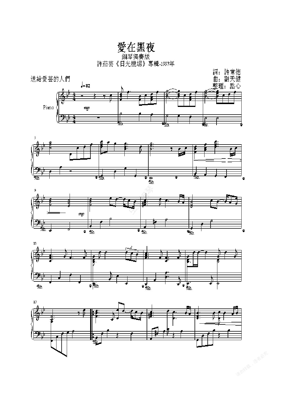 歌手:许茹芸 专辑:《日光機場》-1997 词 许常德曲 刘天健 心 早被你爱成永夜 我 早已经习惯漆黑 隔著窗户 霓虹世界好美 朦胧的月 你绊住谁 誓约 也许不实现才对 而我 是盗梦的贼 不肯入睡 偷你来和我相会 日复一日 夜复一夜 多么愚昧 爱在黑夜 流星一颗颗向心里坠 我情愿离别 是永生的离别 哭过的泪 我无力去追 我爱到深夜 往事一幕幕向火里推 我燃烧成灰 在爱情的夏夜 埋葬我的心灰 你的一切 最怕黎明来代你赴约 我要我的心 我的情 我的苦 我的泪 不是白费