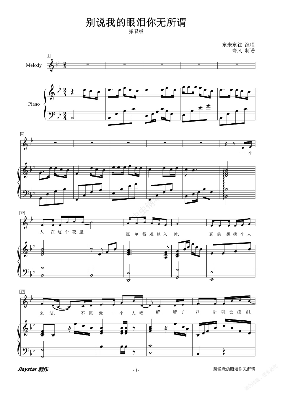 钢琴谱:别说我的眼泪你无所谓