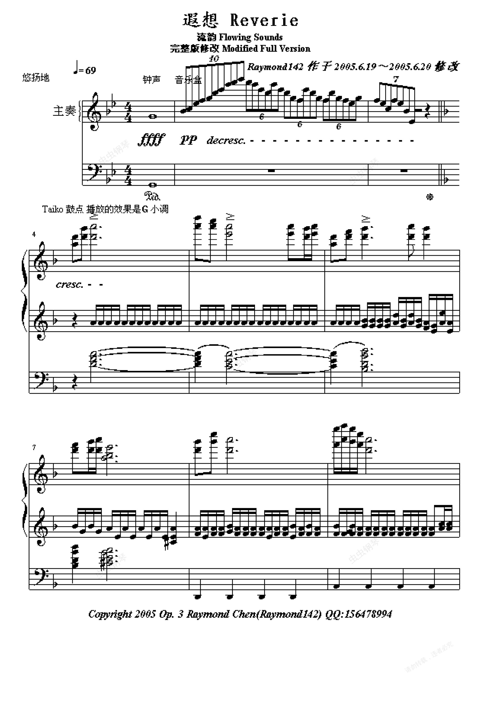 * 请注意:旧式声卡在播放踏板效果时会产生不悦耳的重叠声音。如遇此问题,请将此曲的源文件下载,并且删掉每段底部的“Ped.”和“*”符号,即消除踏板效果再播放。