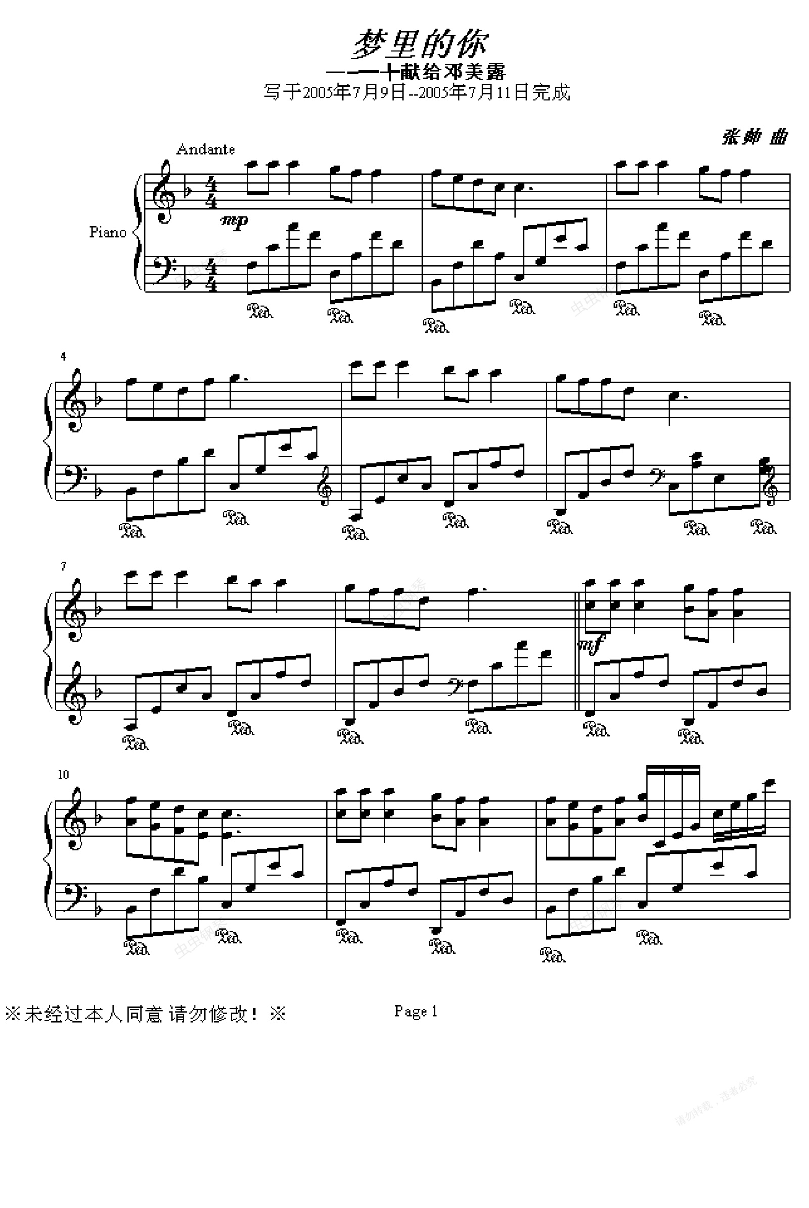 钢琴谱:梦里的你