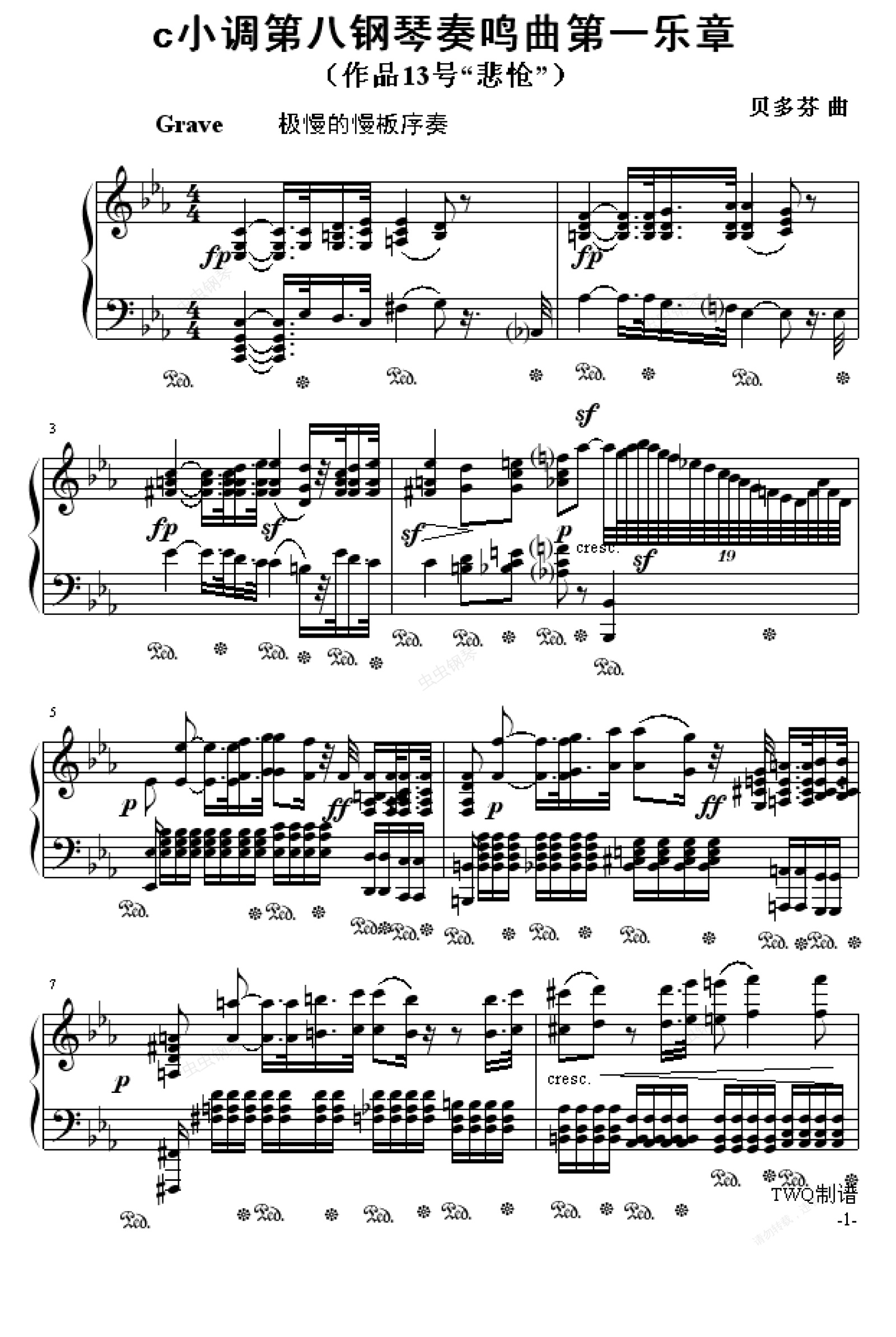 c小调,第八号钢琴奏鸣曲《悲怆》, 这是达到了贝多芬早期钢琴奏鸣曲之顶峰的杰作,也是因其戏剧性的优美旋律而为世人所熟悉的作品。本曲无论在内容、旋律和结构等诸多方面,都渗透着一种日耳曼民族特有的理性,这也是贝多芬等德国音乐家共有的特质。本曲的演奏技巧并不太难,因此被演奏的机会也非常之多,更是许多钢琴初学者爱不释手的曲目。在贝多芬的钢琴奏鸣曲中,《悲怆》是第一首由他本人亲自写上标题的作品。关于"悲怆"这个辞汇,与贝多芬后半生那感人肺腑而又凄怆深刻的悲剧性生活还有相当的一段距离,因为这毕竟是他的早期作品。