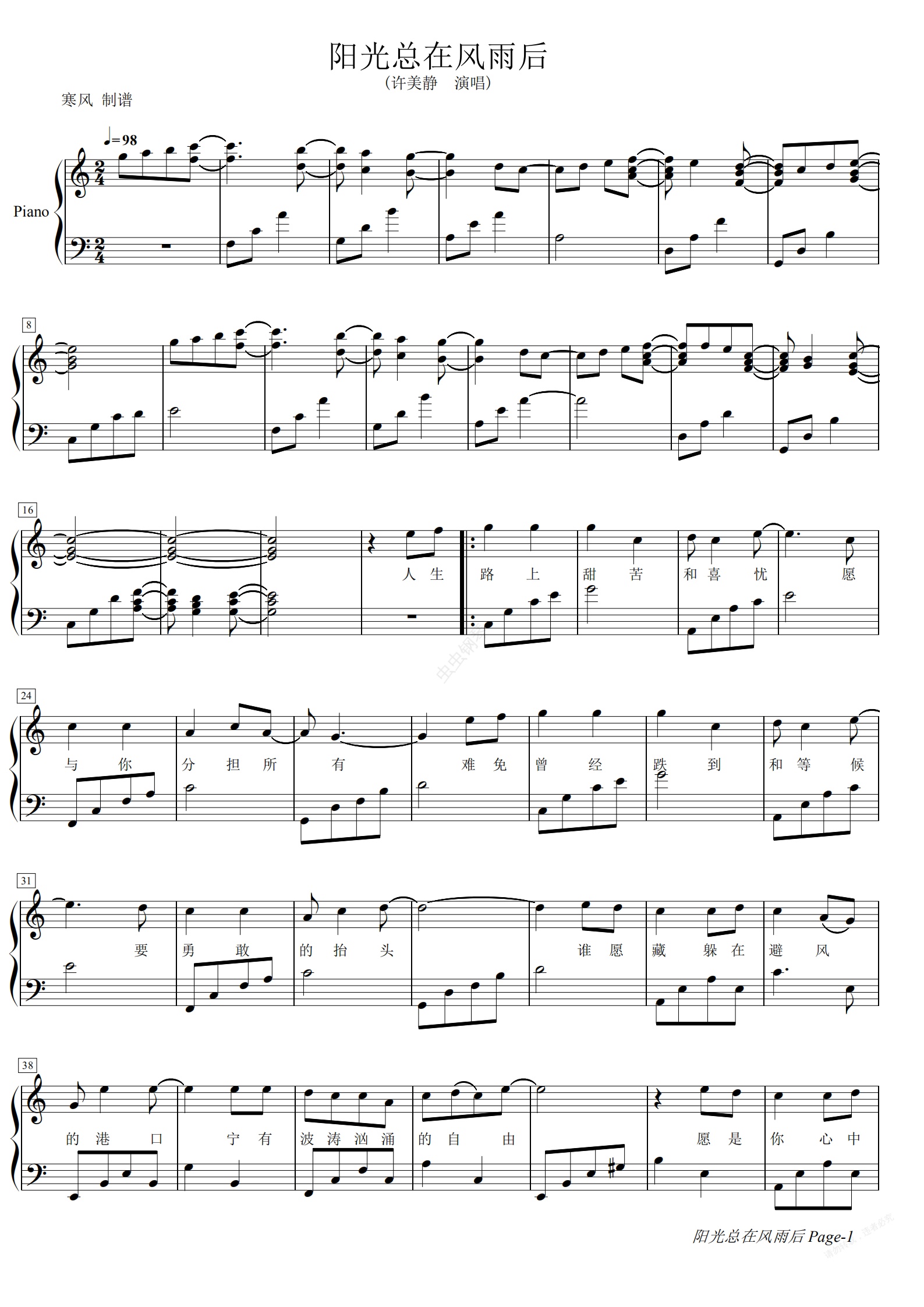 与大家共勉。 C Am人生(路)上甜苦(和)喜忧 F C愿(与)你分担所(有) C Am难免(曾)经跌到(和)等候 F G3要(勇)敢的抬(头) F C谁愿(常)躲在避风(的)港口 F C宁有(波)涛汹涌的自(由) F C愿是(你)心中灯塔(的)守候 F G3在(迷)雾中让你看(透) C G(阳)光总在(风)雨后 Am Em(乌)云上有晴(空) F C(珍)惜所有(的)感动 F G3每(一)份希望在你手(中) C G(阳)光总在(风)雨后 Am Em(请)相信有彩(虹) F C(风)风雨雨(都)接受 F G3 C我(一)直会在(你)的左(右)